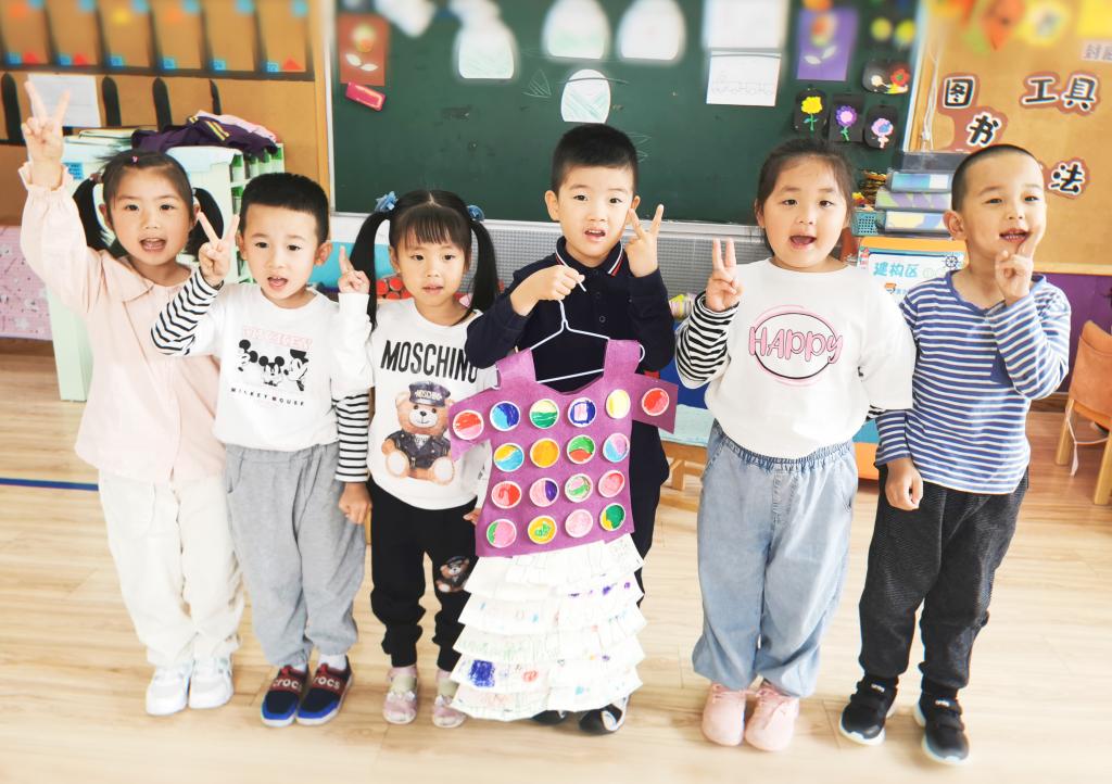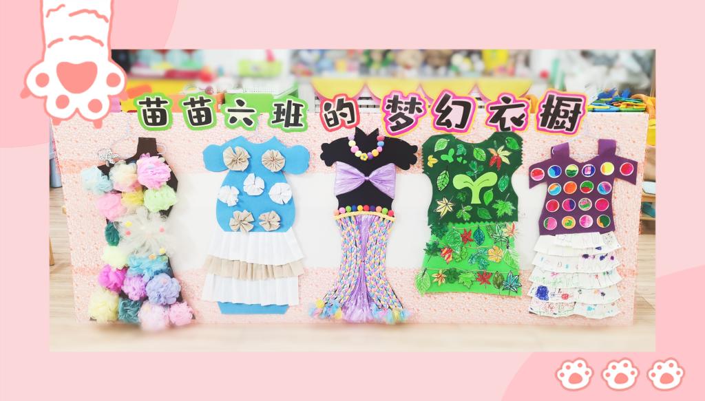 苗苗六班结合着幼儿年龄特点以及班级主题活动“漂亮的衣服”主题,最终商讨并确定了展板主题为“梦幻衣橱”。孩子们从家中带来了彩色垃圾袋、彩色浴球以及使用大量的手工材料,根据内心的想法大胆表现和创造,制作出一件件漂亮的衣服。