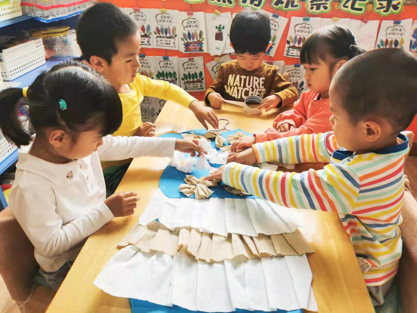 卫生纸巾可以做裙子吗?苗苗六班小朋友的回答是“当然可以”!小小的纸巾捏在一起可以做成一个小蝴蝶结,两个小蝴蝶结组成一起就可以变成一朵小花。百褶裙就是由很多张纸抽组成的,你看出来了吗?