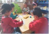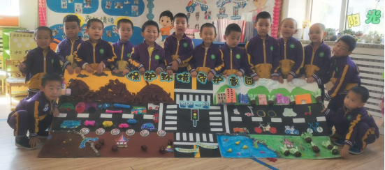 展板的背景由老师负责,孩子们自主地开动脑筋想出环保的制作材料和方法,用彩泥和图形来制作车辆;用皱纹纸撕成条状来粘贴失去植物的小山;用水彩笔和蜡笔来绘画滑板车和自行车;用纸杯底来制作自行车的车轮,用纸杯口来拓印车轮;用油水分离画的方式来画出草地;用卷纸芯来制作树桩,用棉花和纸巾来制作云朵;在草地上加上喷水阀,来呈现出喷出水滴灌溉草地的画面,孩子们忙得不亦乐乎。充分地体现出我园“有兴趣,能专注,喜探究,愿合作”的良好学风。