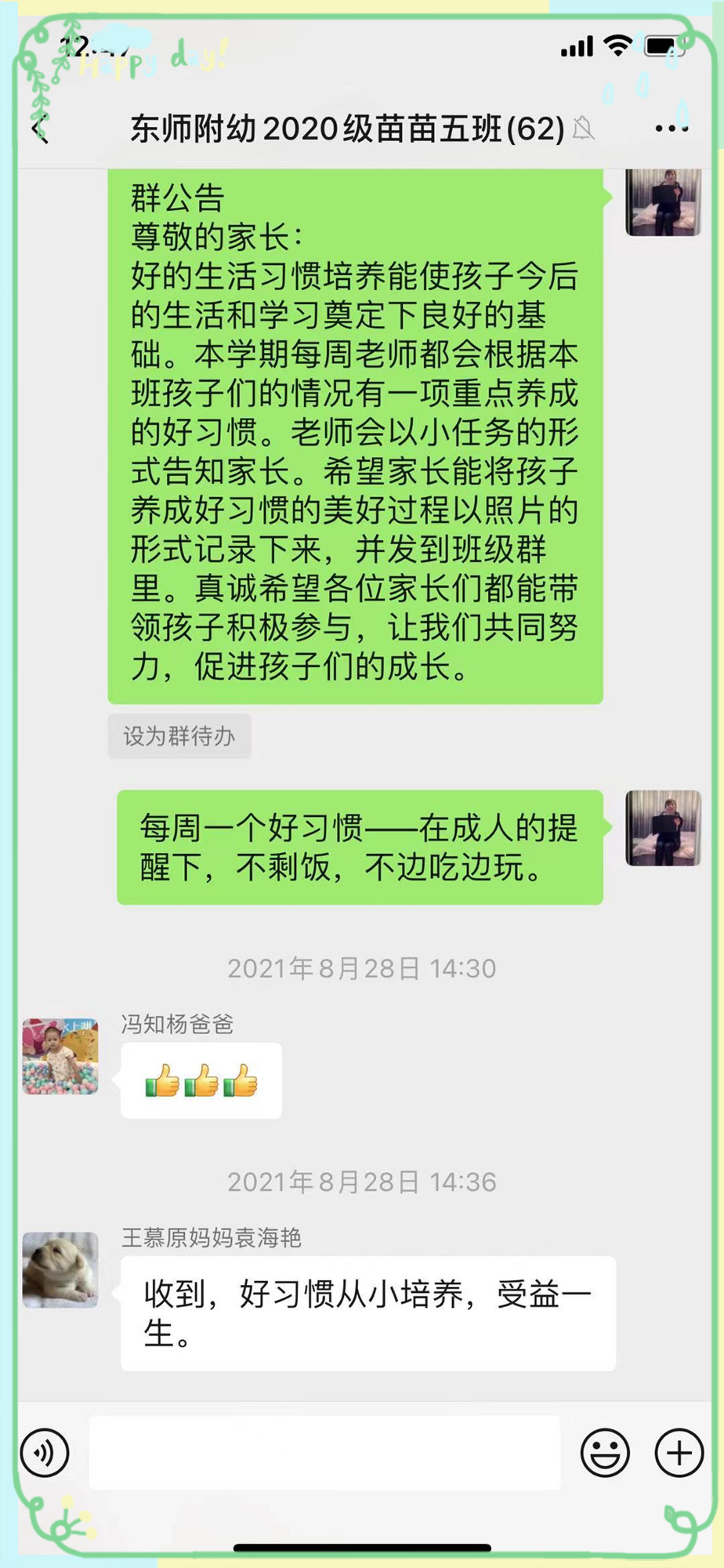 为了帮助宝宝在家庭中巩固良好的用餐习惯,我们通过家园配合打卡,并用照片或者视频的形式记录幼儿在家独立进餐的过程,相信通过家长们长时间的坚持与配合,宝贝们会逐步养成良好的饮食习惯!