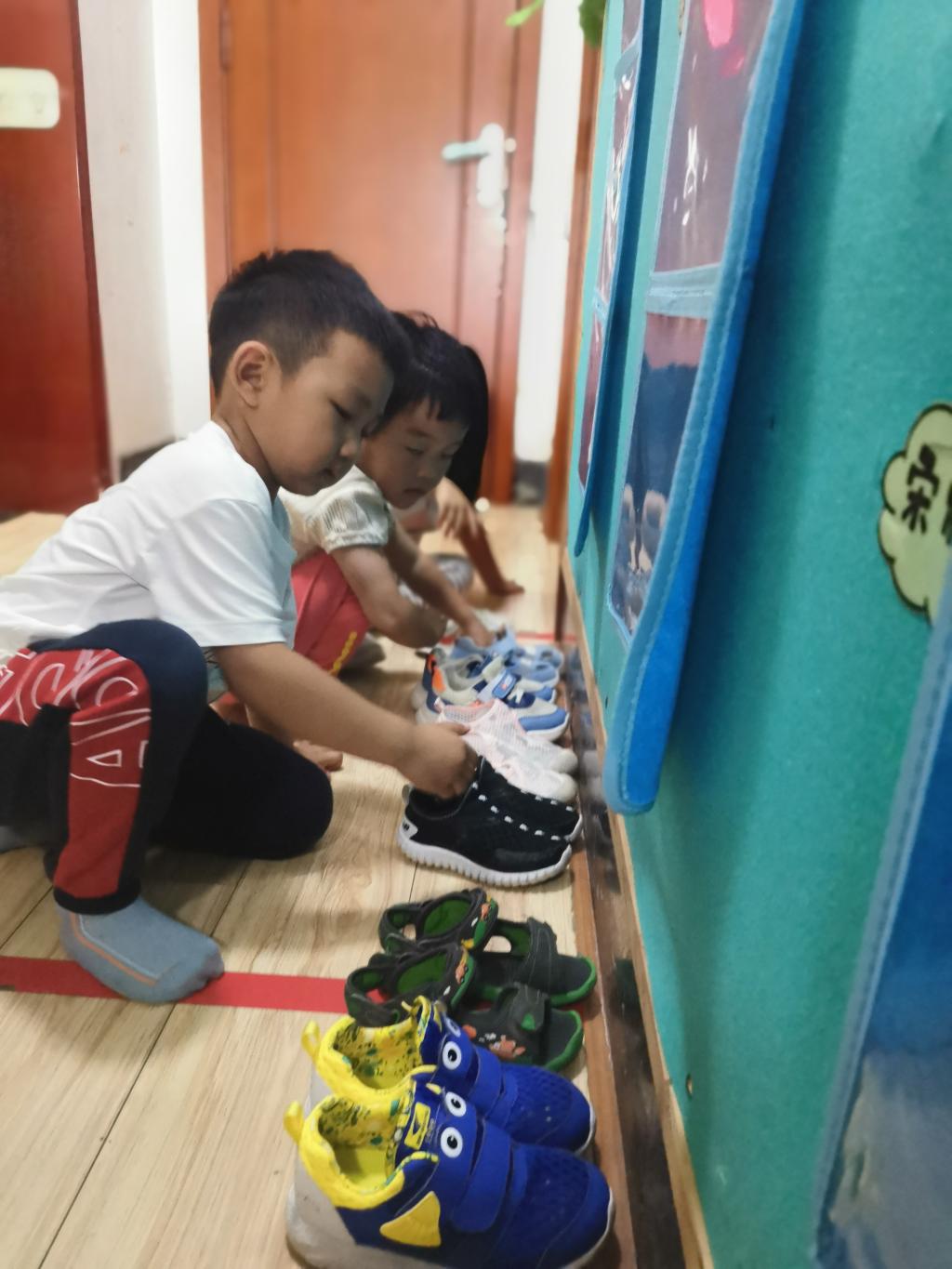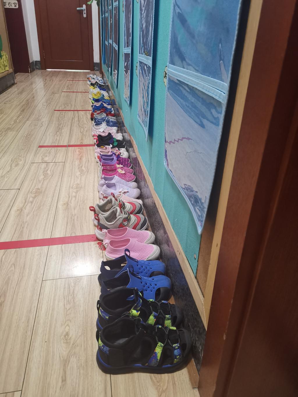 伴随着优美的歌声午睡时间到啦!宝贝们把自己的小鞋子脱下来,整齐的摆放在寝室外面,有序的走进寝室。