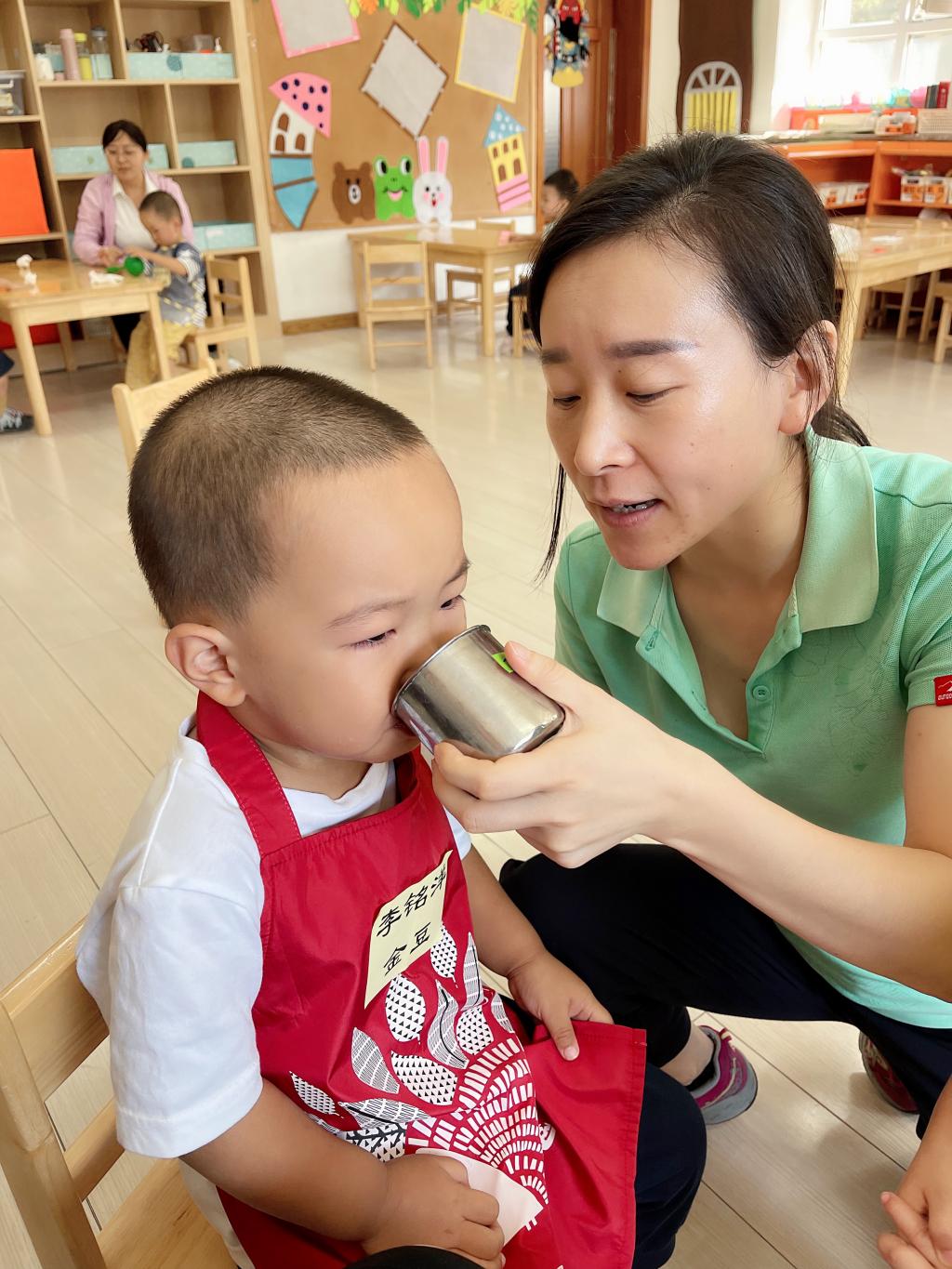 我要多多的喝水,这样我才能漂漂亮亮!可爱的老师妈妈还喂我喝水,我爱老师,老师就像妈妈一样爱护我。