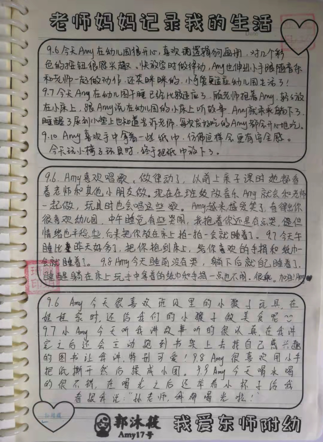 老师为孩子记录精彩的成长瞬间,家长将自己的感受、期待反馈给老师——缴园长提出的温暖的东师附幼特色家园沟通交流,拉近了幼儿园和家长的心,真诚温暖的家园合作成为孩子们健康成长的坚实后盾。