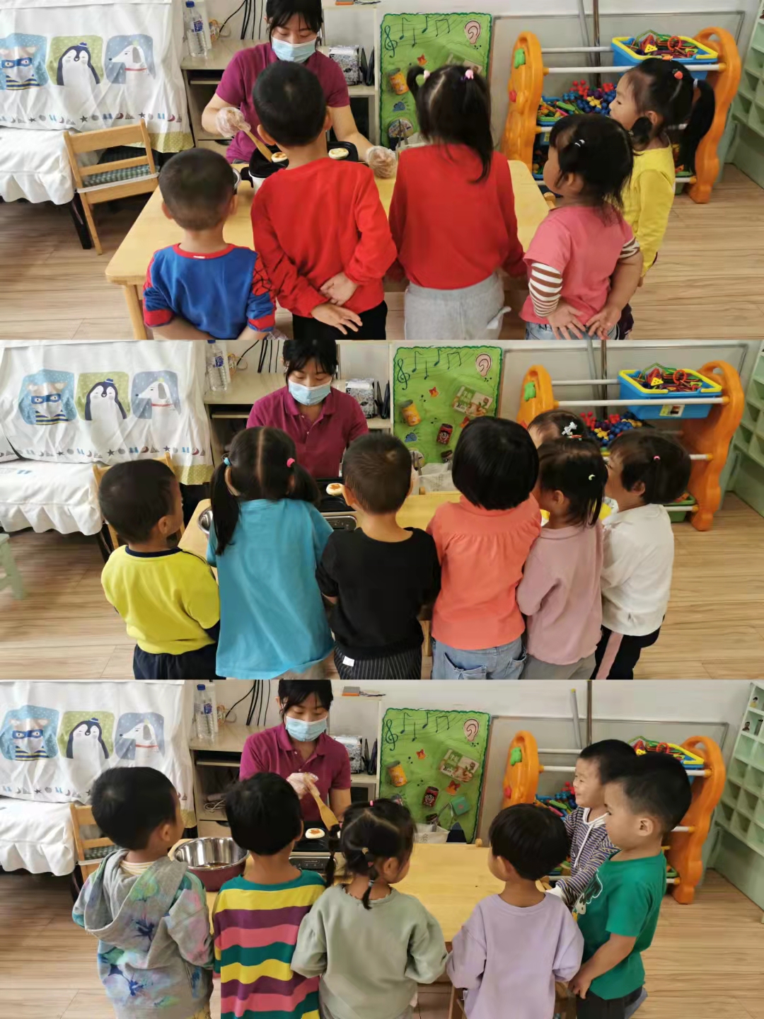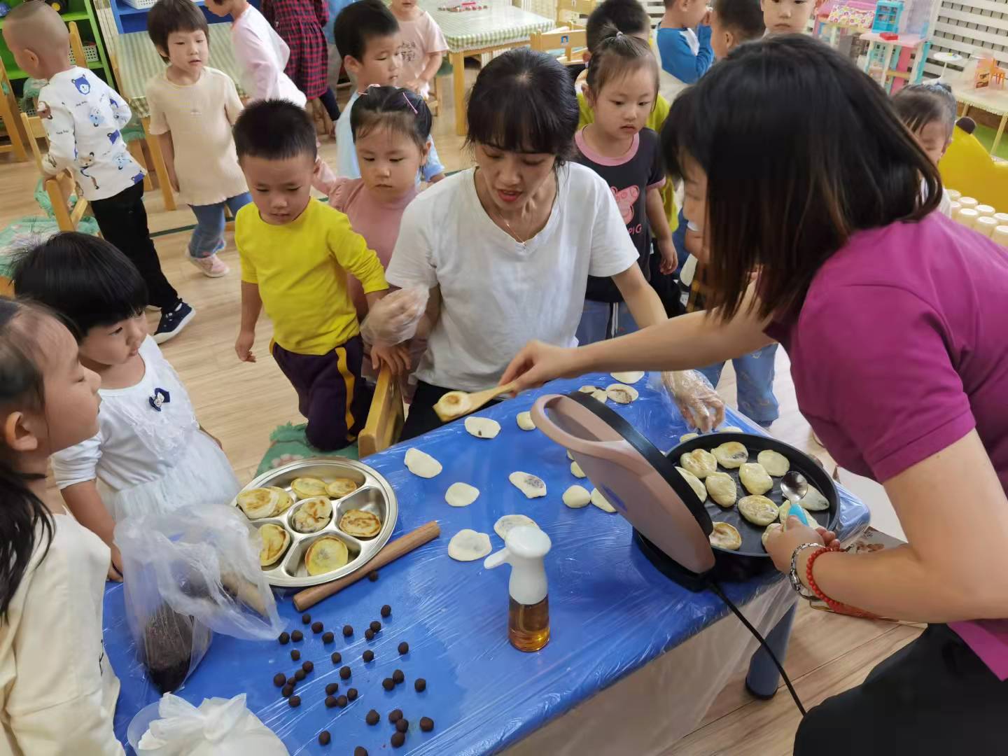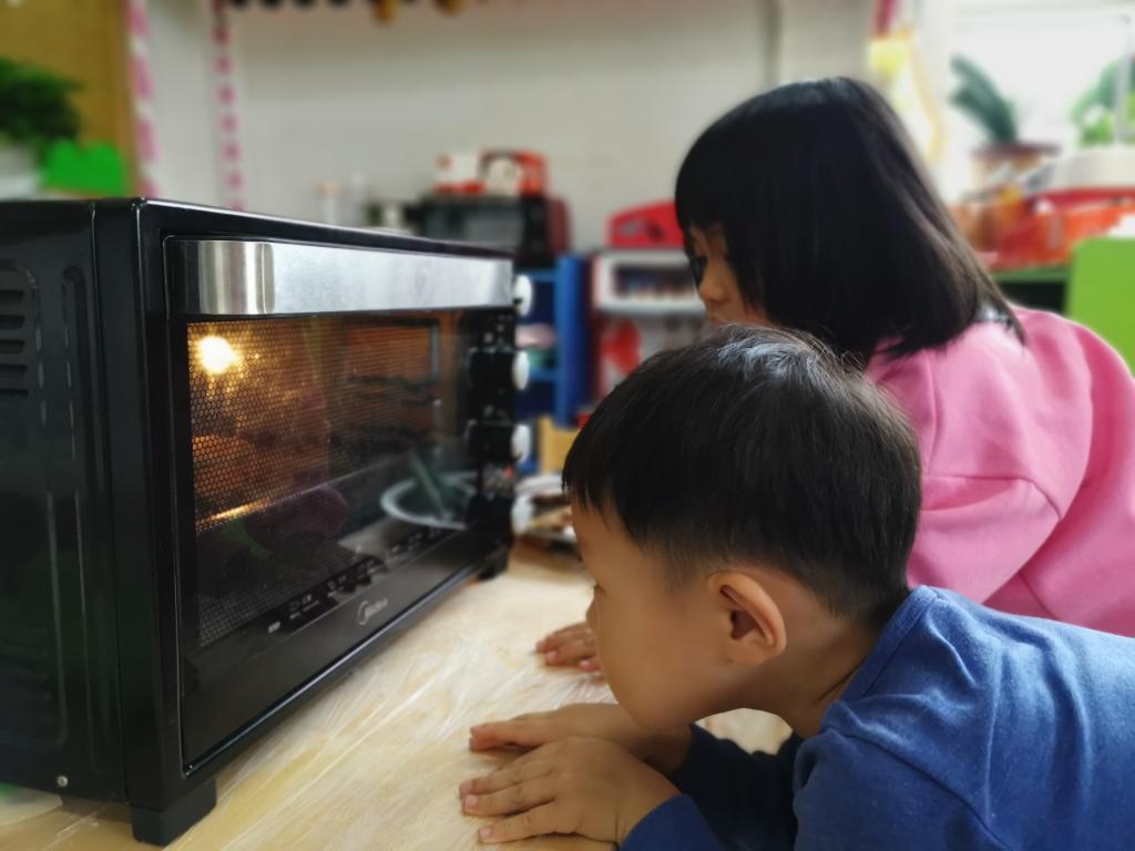 在老师的帮助下,团圆饼终于进入饼铛和烤箱中,宝贝们趴在旁边,紧紧盯着自己的成果,时不时的问老师还有多久可以吃到,满脸的兴奋和紧张。