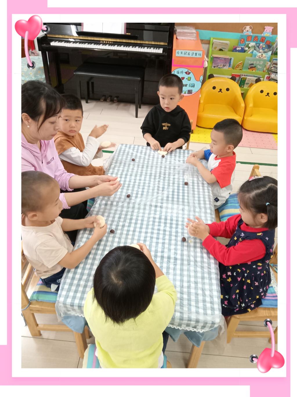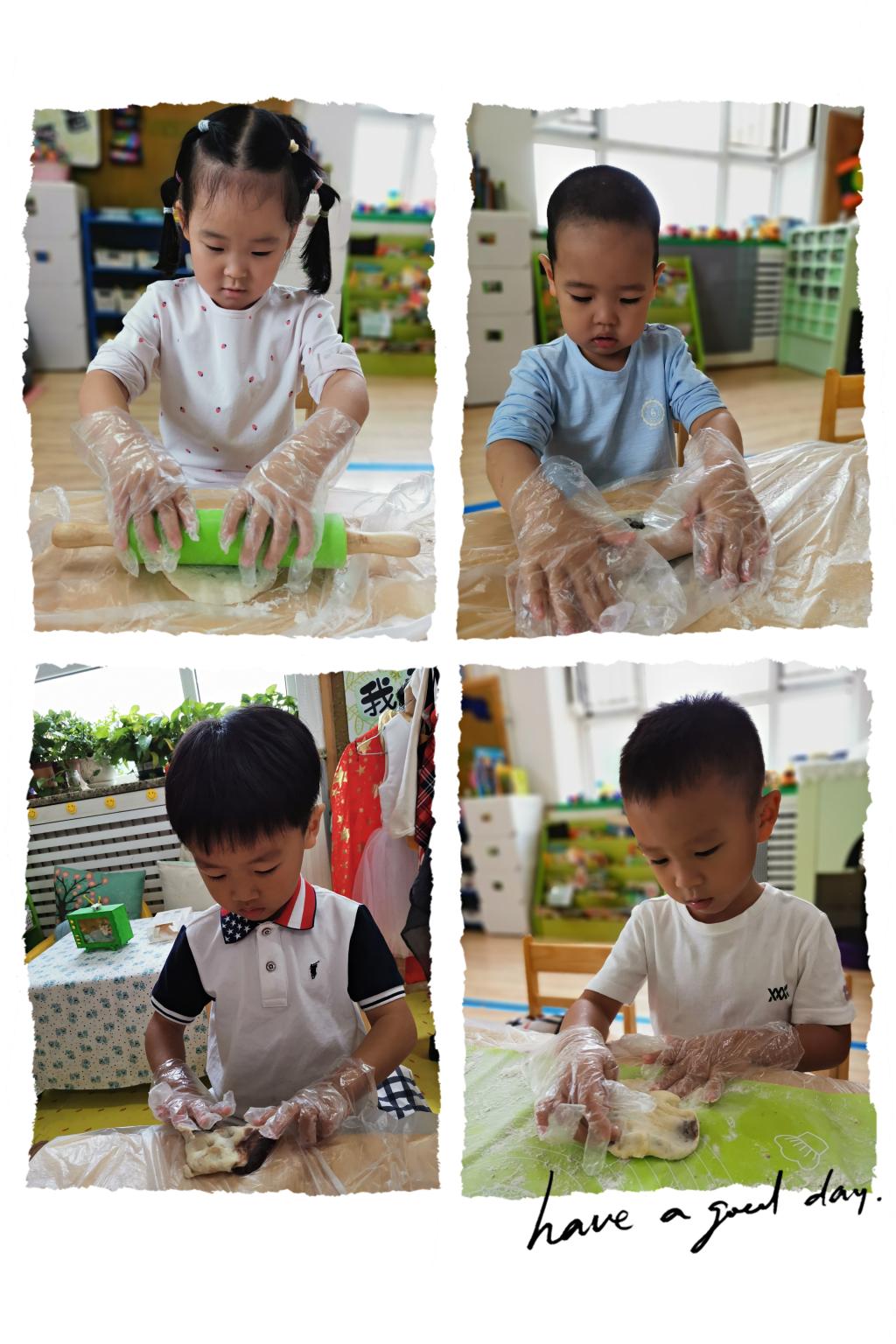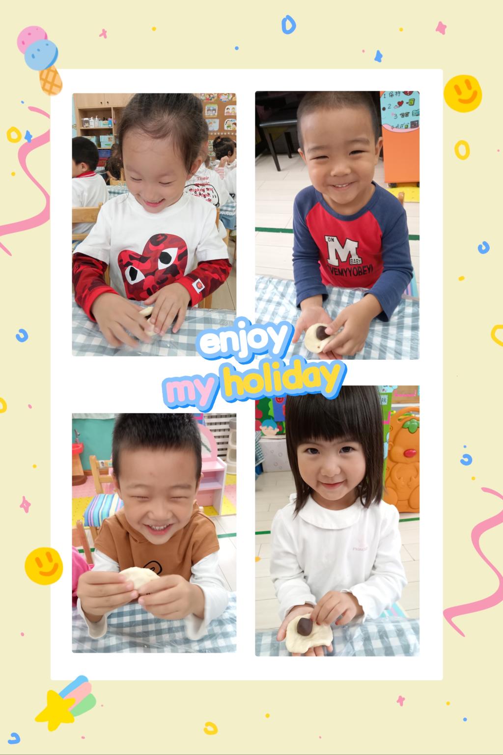 快看,宝贝们的创造力好强啊,有的宝贝用擀面杖将小饼擀的薄薄的、有的宝贝用小手指在上面戳一些小洞、有的宝贝将小饼捏成爱心的形状...很快形态各异的团圆饼摆满了整整一桌。