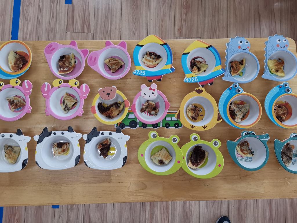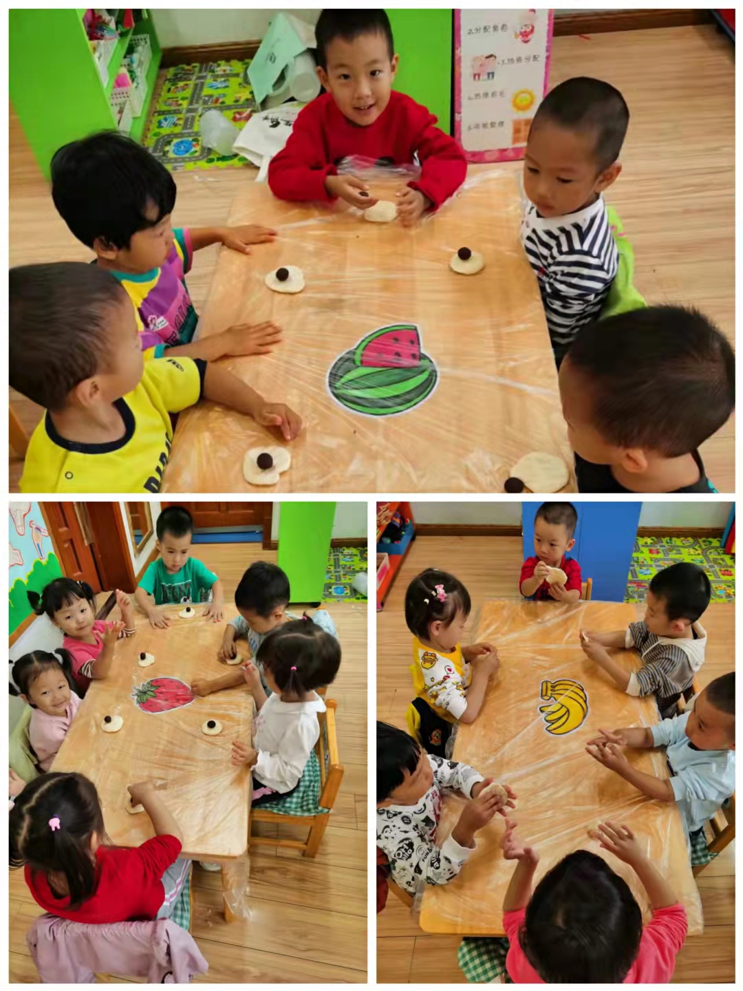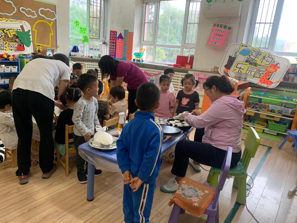快看,宝贝们的创造力好强啊,有的宝贝用擀面杖将小饼擀的薄薄的、有的宝贝用小手指在上面戳一些小洞、有的宝贝将小饼捏成爱心的形状...很快形态各异的团圆饼摆满了整整一桌。