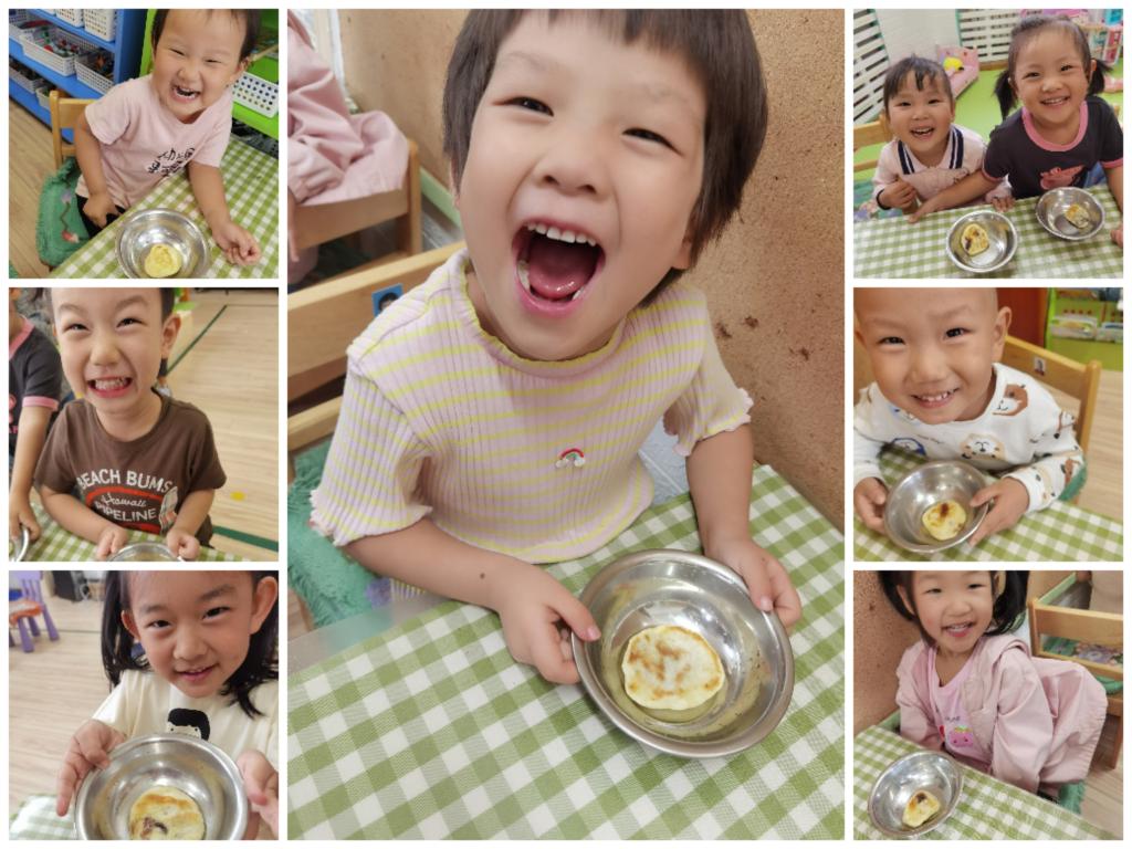 “哇!好香呀!”团圆饼终于做好啦!宝贝们满足的捧着自己亲手制作的、热乎乎的团圆饼,很是自豪。宝贝们将自己制作的团圆饼分享给自己的好朋友,同时也将自己的快乐分享了出去。