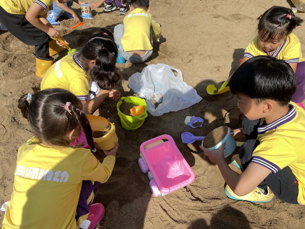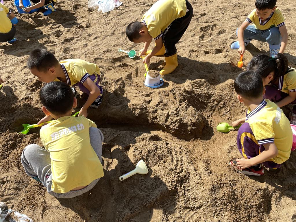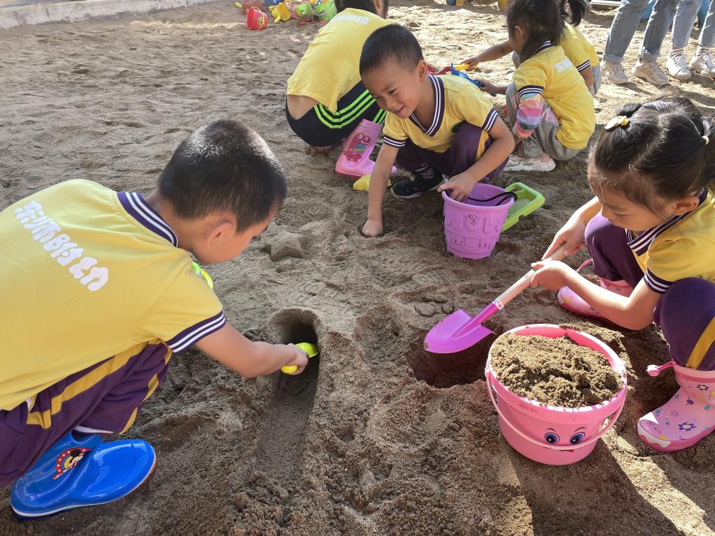 在游戏中沟通与交流,进一步发展了幼儿的社会交往能力。让宝贝们勇于自己探索!玩沙是儿童与大自然最亲密的接触,他们会沉浸其中,流连忘返……