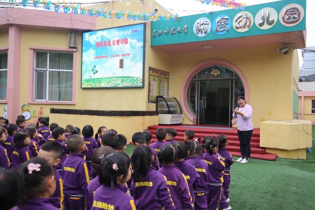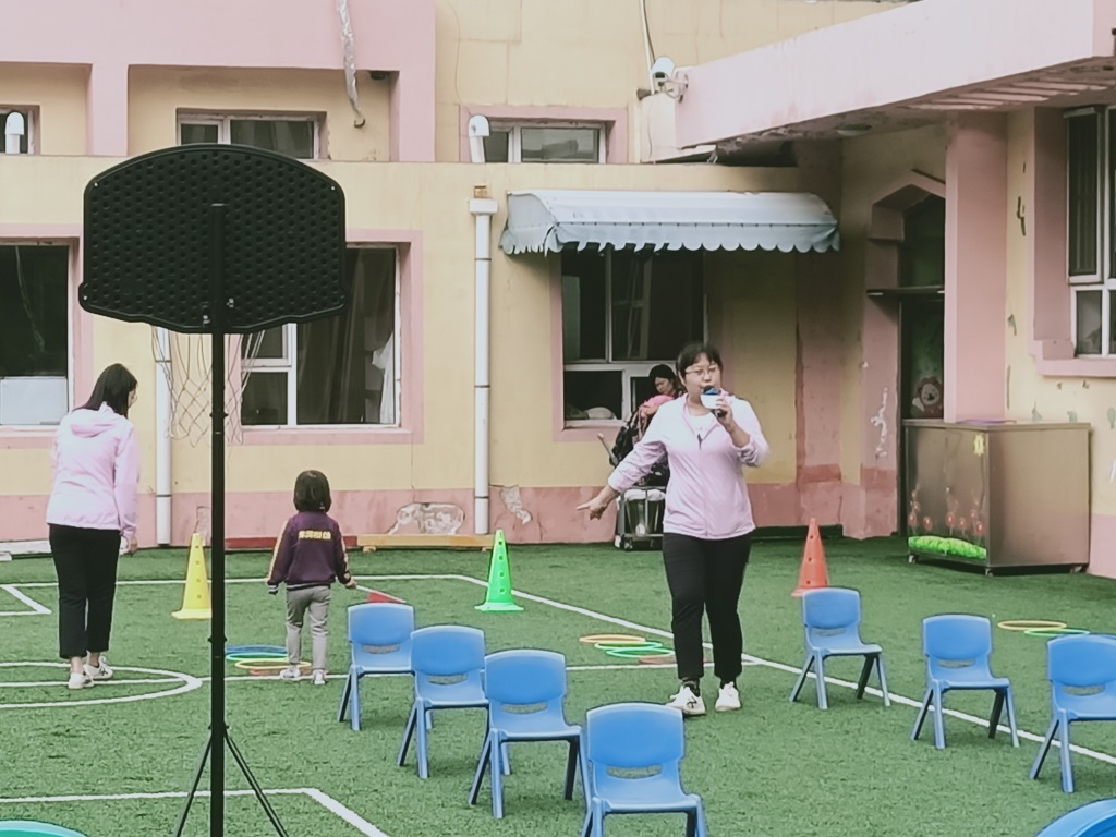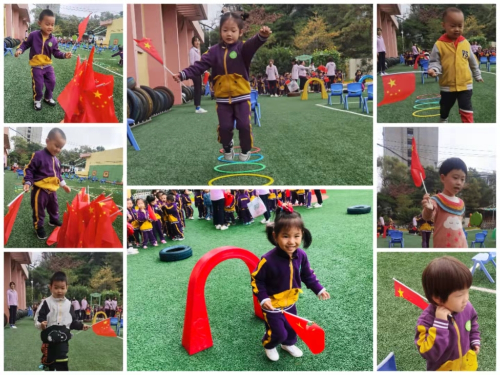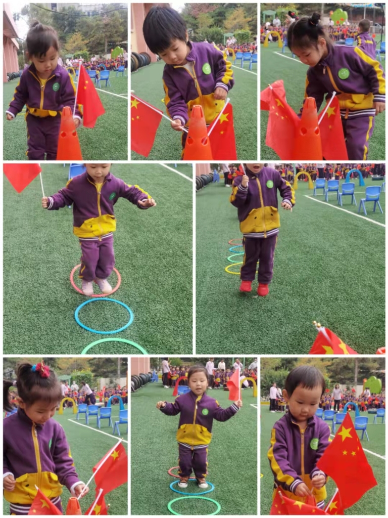 游戏开始前,李老师为小朋友讲解游戏方法:小朋友们翻过“山丘”、钻过“山洞”、穿越“沼泽”、跳过“地雷”……穿过重重阻碍,将鲜艳的五星红旗插在终点。