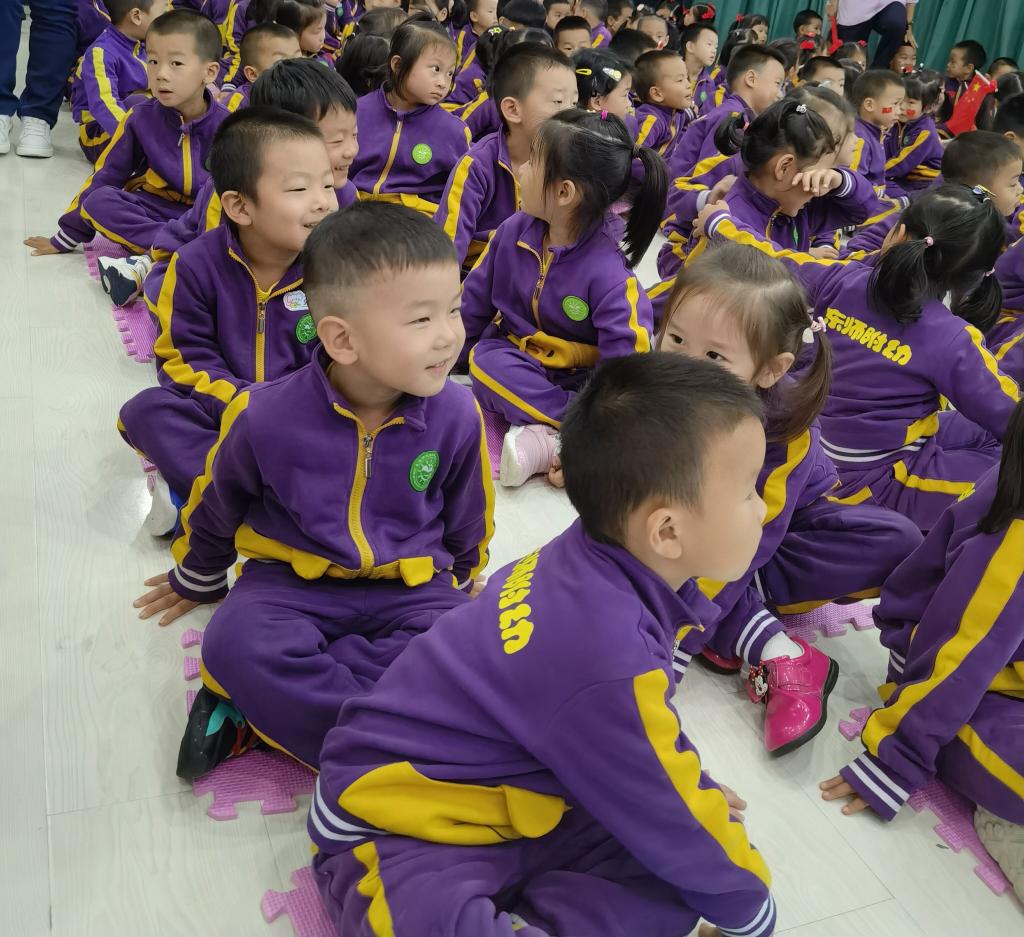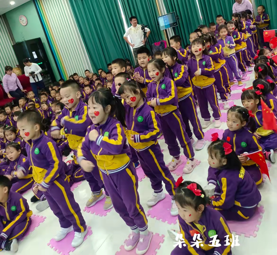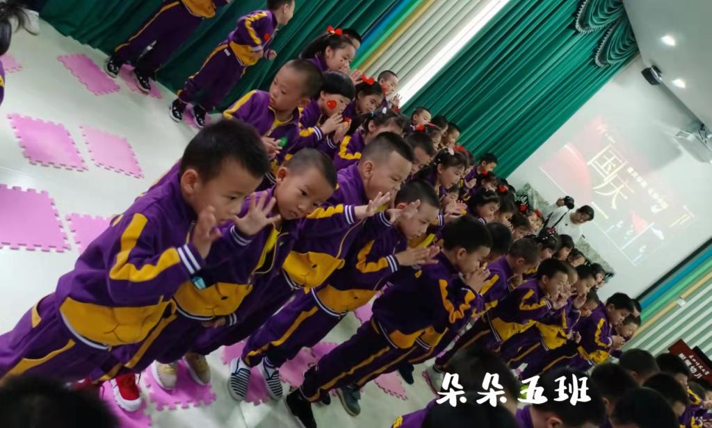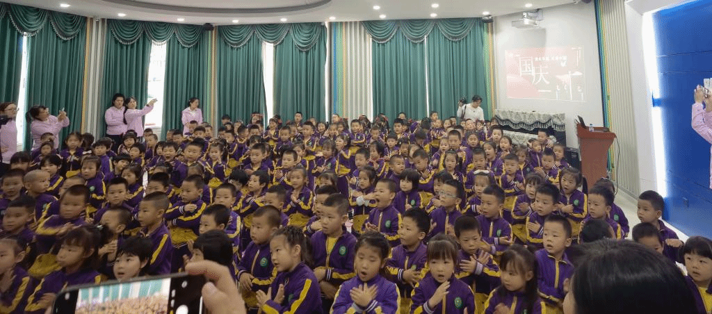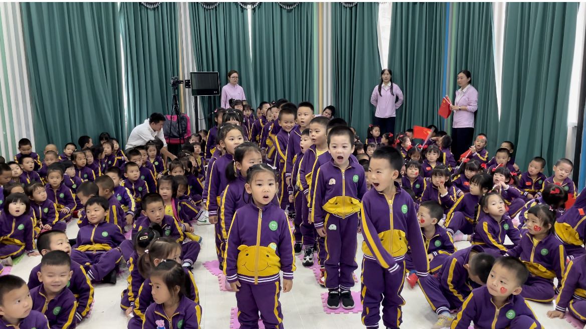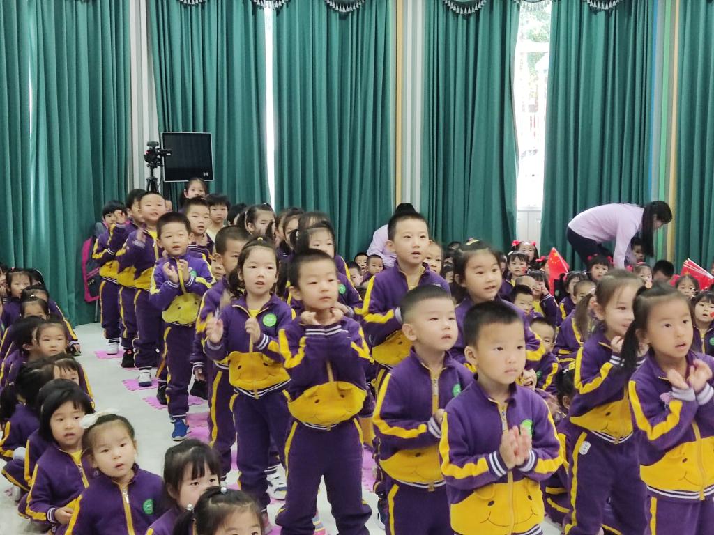 拉歌活动开始啦,小朵朵们精神饱满,歌声嘹亮,激情昂扬,纵情歌唱。有“五星红旗飘扬蓝天上,自由的鸟儿飞到那远方,我要好好读书天天向上,实现心中小小的梦想”的《中国么么哒》;有“中华大家庭、四海皆同心、学好中国字、做好中国人”的《中国字 中国人》;有“我们是祖国的花朵,阳光下尽情唱着歌,看我们幸福的生活,像花儿五彩的颜色”的《祖国的花朵》;有“祖国妈妈是我出生后的摇篮,祖国妈妈是我听到的第一支摇篮曲,我们都深深的爱着祖国妈妈,她有一个响亮的名字叫中国”的《我的国家》;有“有个国家她很伟大,这里的人都把幸福脸上挂,有个国家她很伟大,五十六个民族团结是一家”的名字叫中国;有“人民生活幸福美满;祖国处处日新月异;祖国的花朵在阳光的照耀下,茁壮成长”的《党是太阳我是花》。小朵朵们用童声深情演绎着爱国歌曲,用童心赞美着祖国的欣欣向荣,用美妙的舞姿尽情展现着多姿多彩的快乐生活。