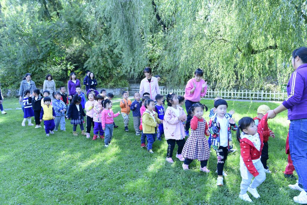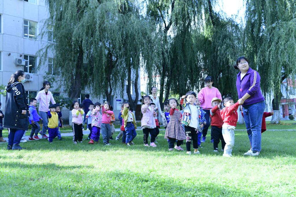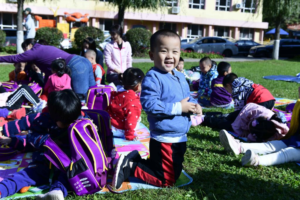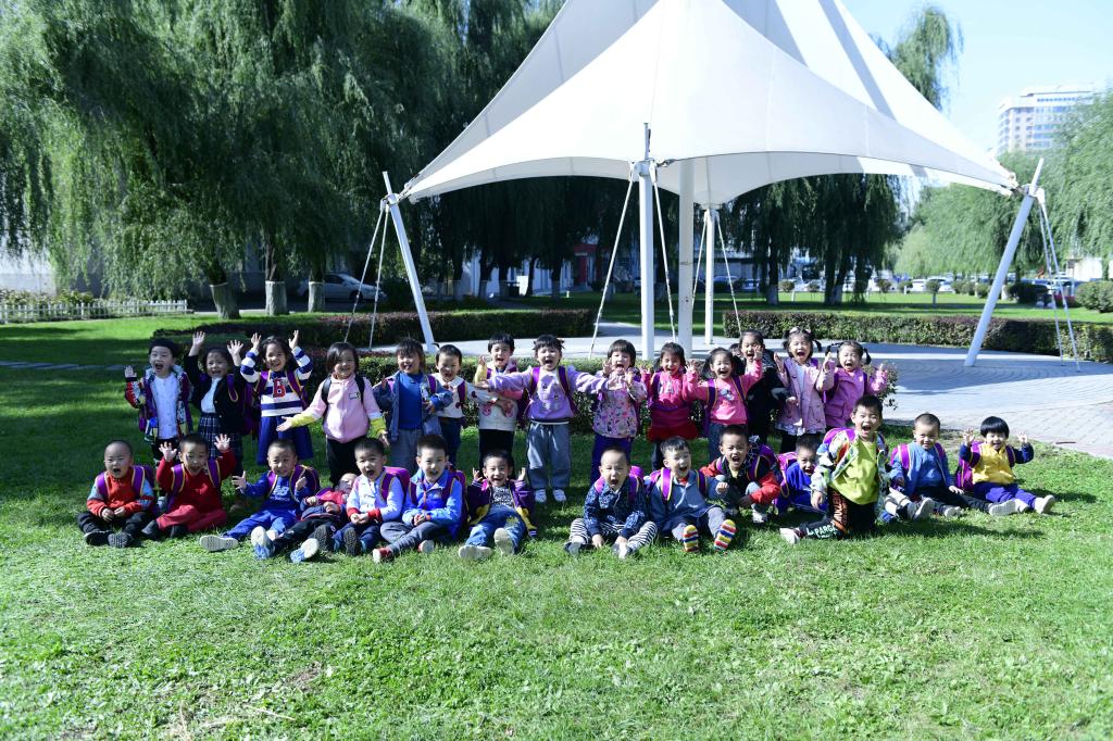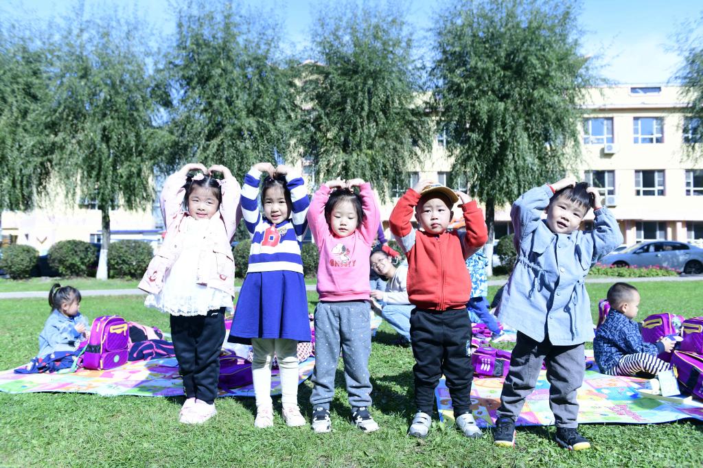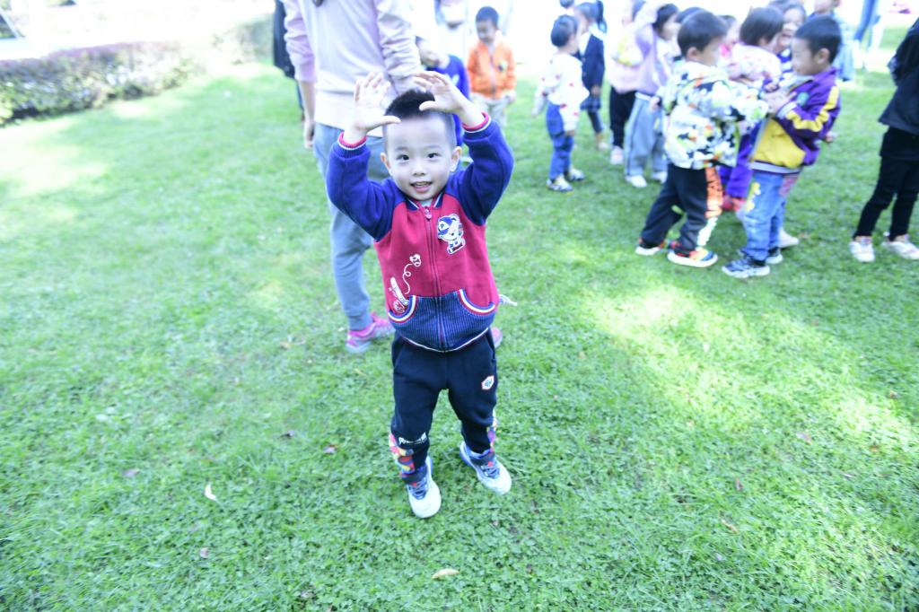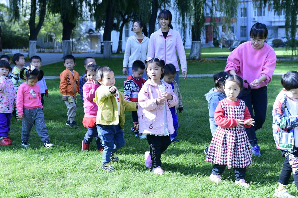 看!孩子们欣赏着深秋美景,享受着同伴在一起的欢乐游戏时光,都露出了一张张天真无邪、灿烂的笑脸。