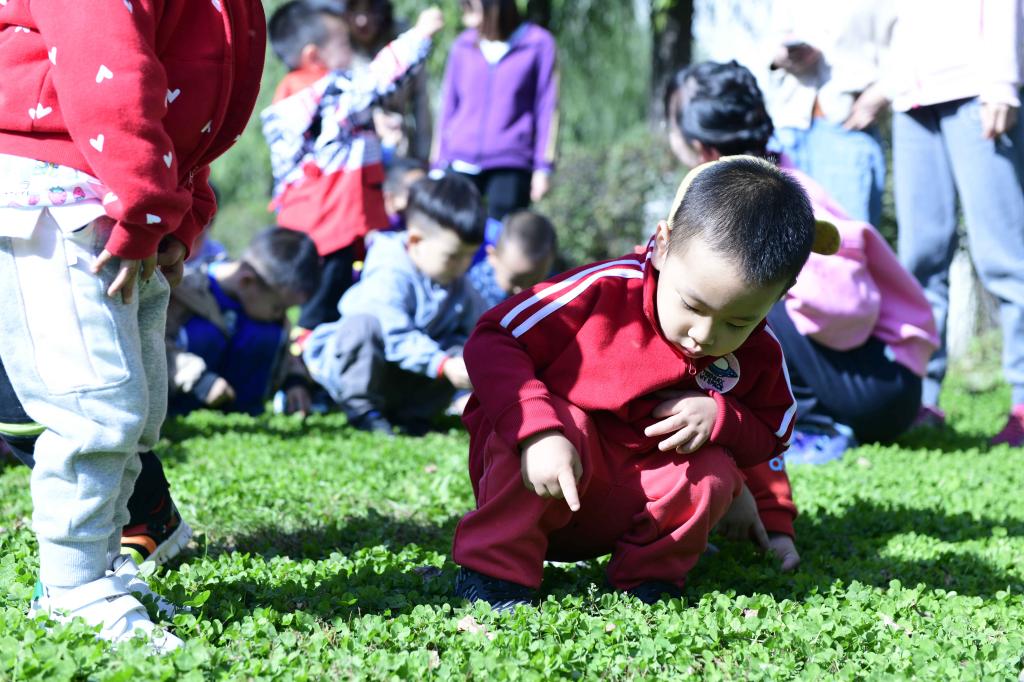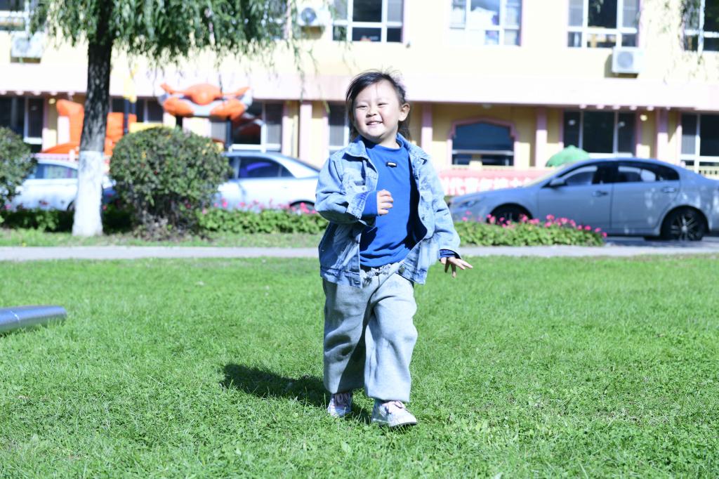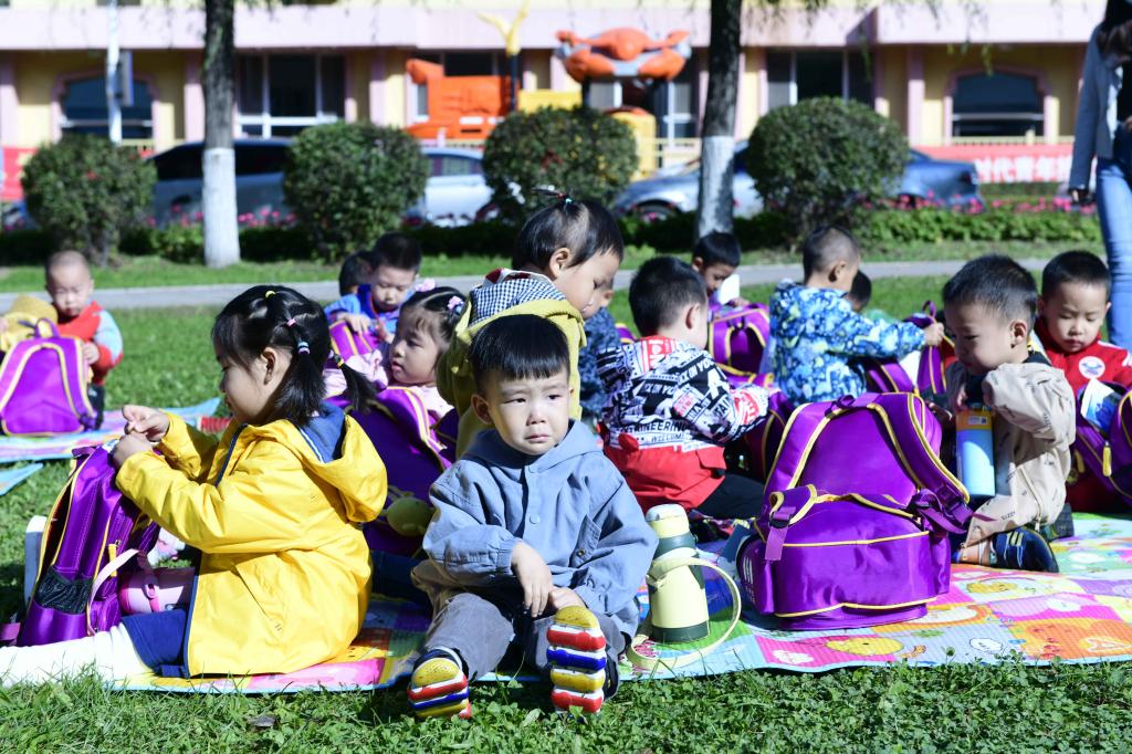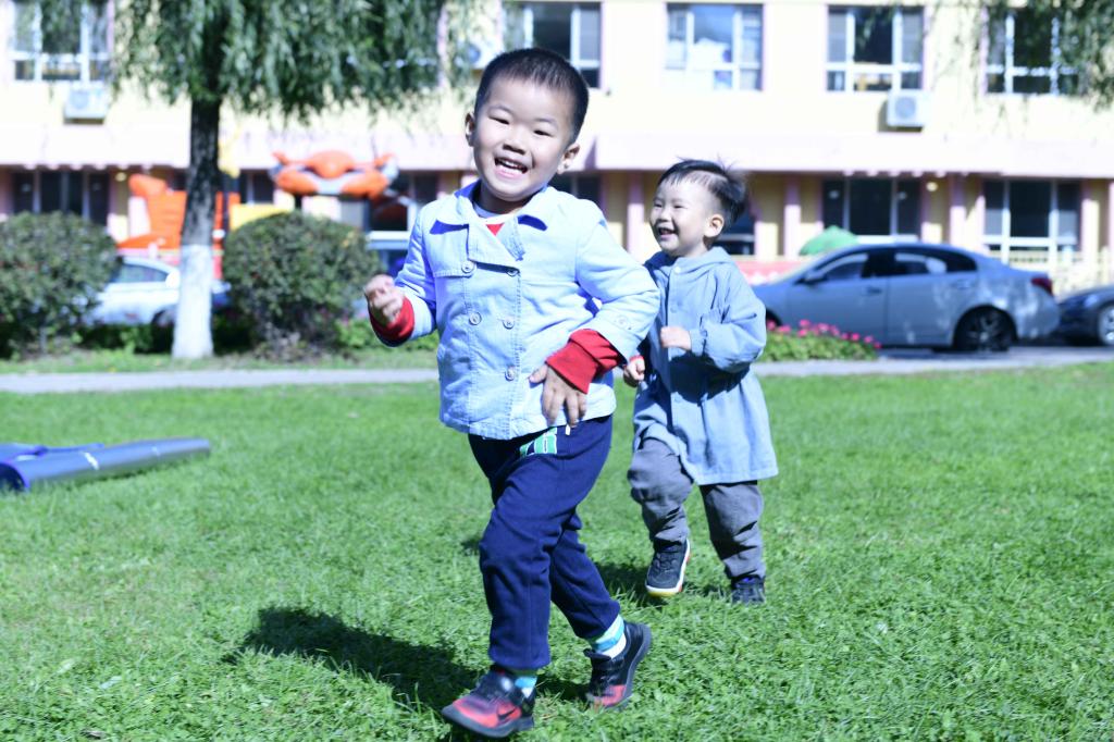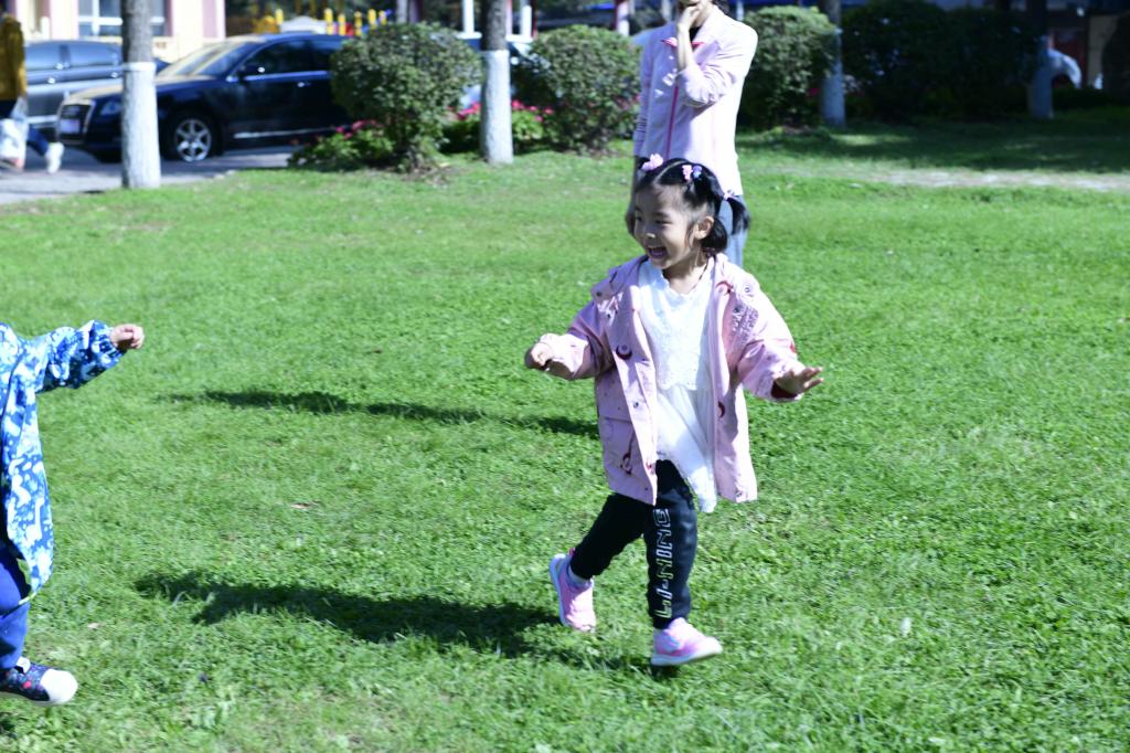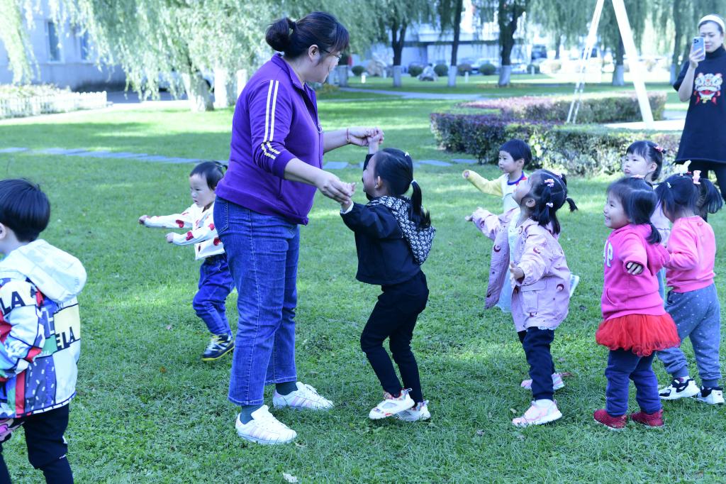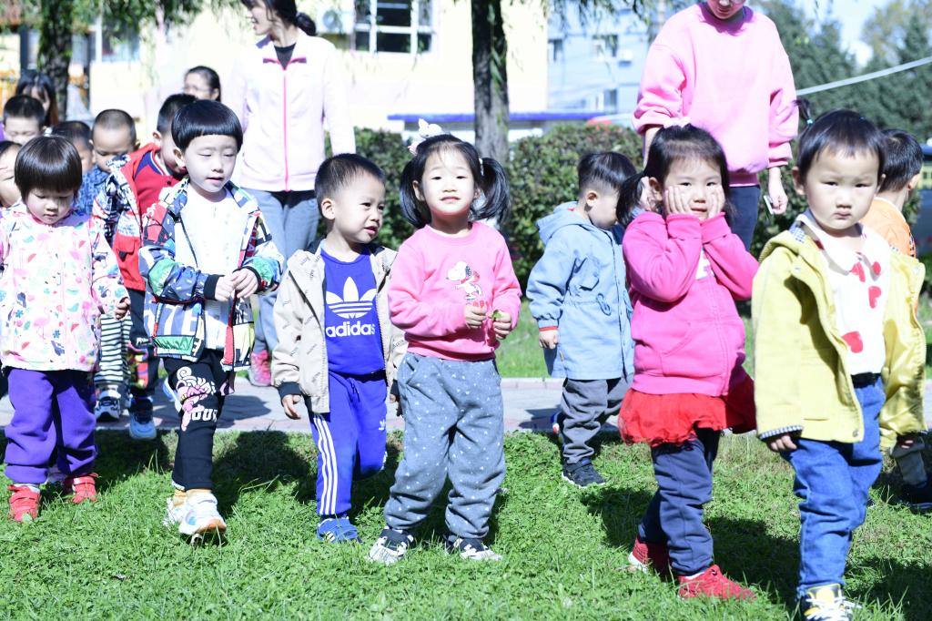 看!孩子们欣赏着深秋美景,享受着同伴在一起的欢乐游戏时光,都露出了一张张天真无邪、灿烂的笑脸。