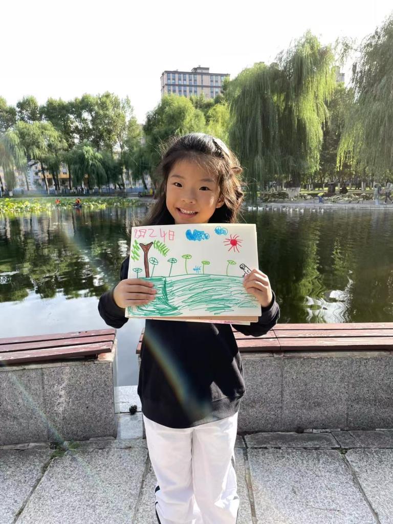在湖边,孩子们席地而坐,徜徉于美景之中,用手中的画笔将静湖的美丽风光定格在画纸上,画眼中所见、心中所想。