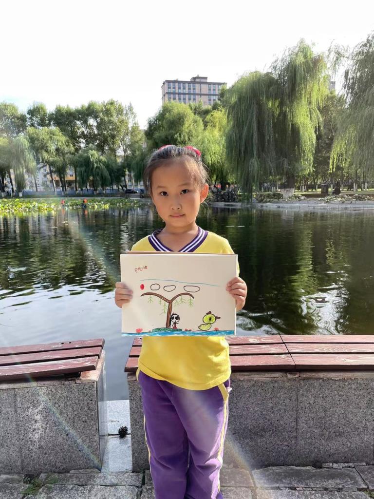 一个星期之后,孩子们再一次背着画板来到静湖,湖中的荷叶打捞干净,露出波光粼粼的湖面,湛蓝的天空映照在湖面上,湖水也瓦蓝瓦蓝的,湖中只有一只小鸭子悠然自得的游来游去。孩子们还观察到岸边的柳叶不再翠绿已经开始变黄,湖中的小岛上有许多野鸡咕咕的叫着。