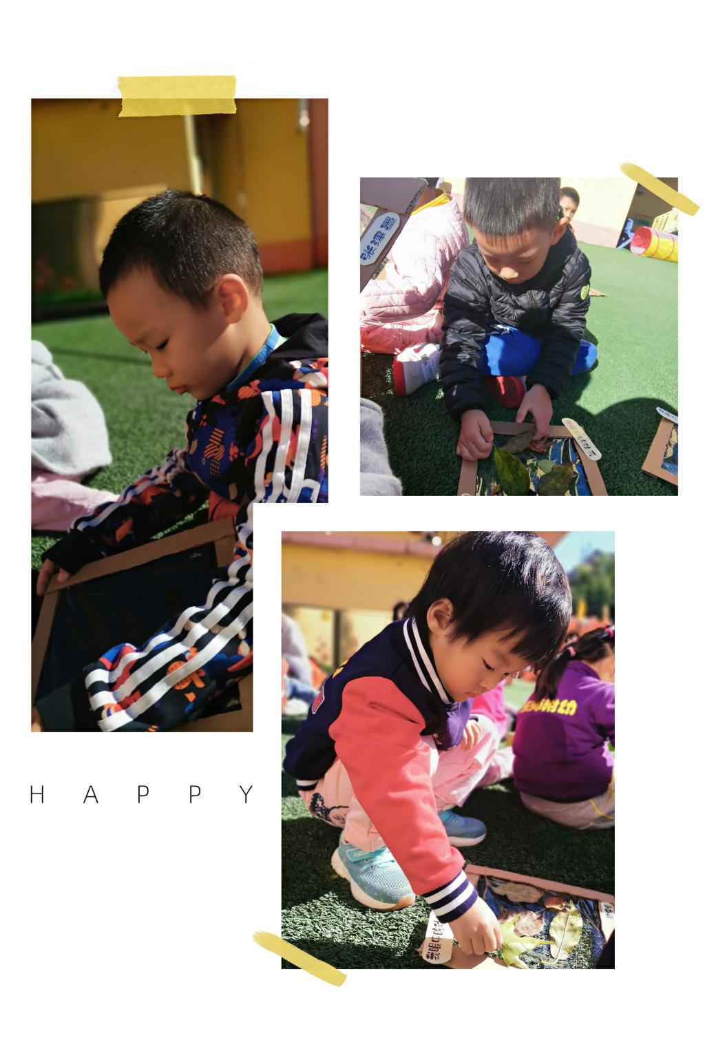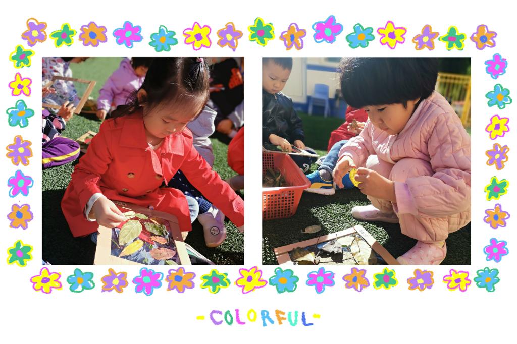 这么可爱的落叶怎么能浪费呢!宝贝们回到幼儿园坐在草地上把自己刚刚捡来的落叶贴在老师事先准备好的相框上。