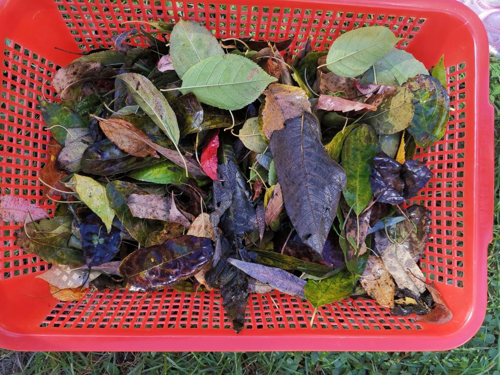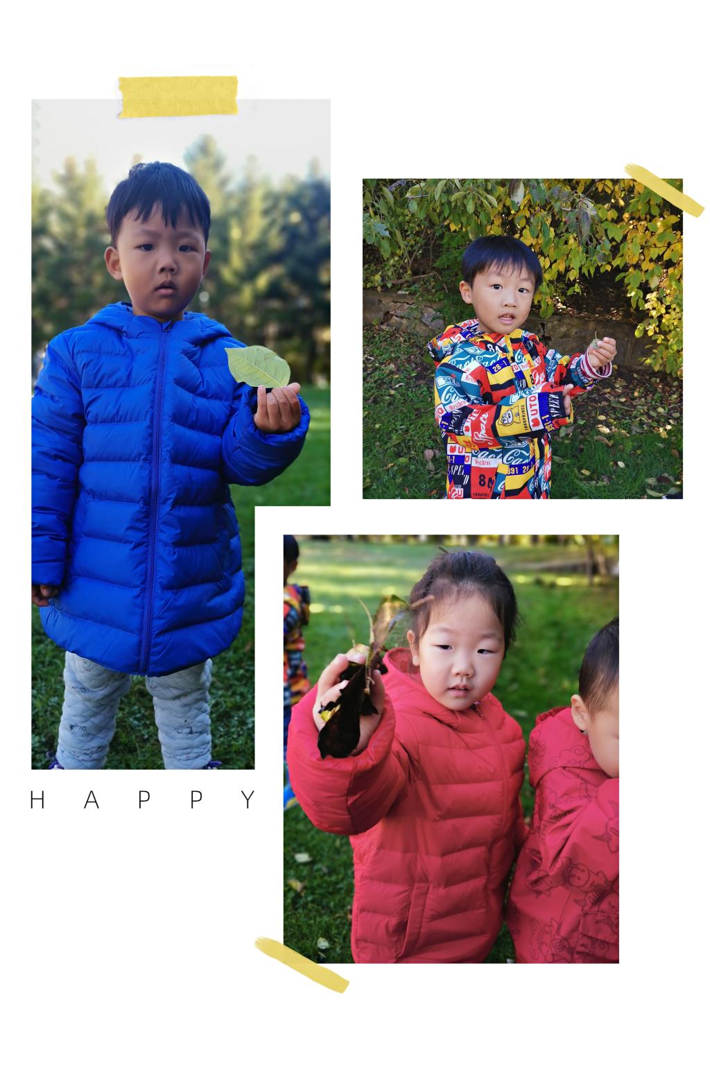 很快,宝贝们捡了满满一筐各种形状、各种颜色、各种大小的落叶。