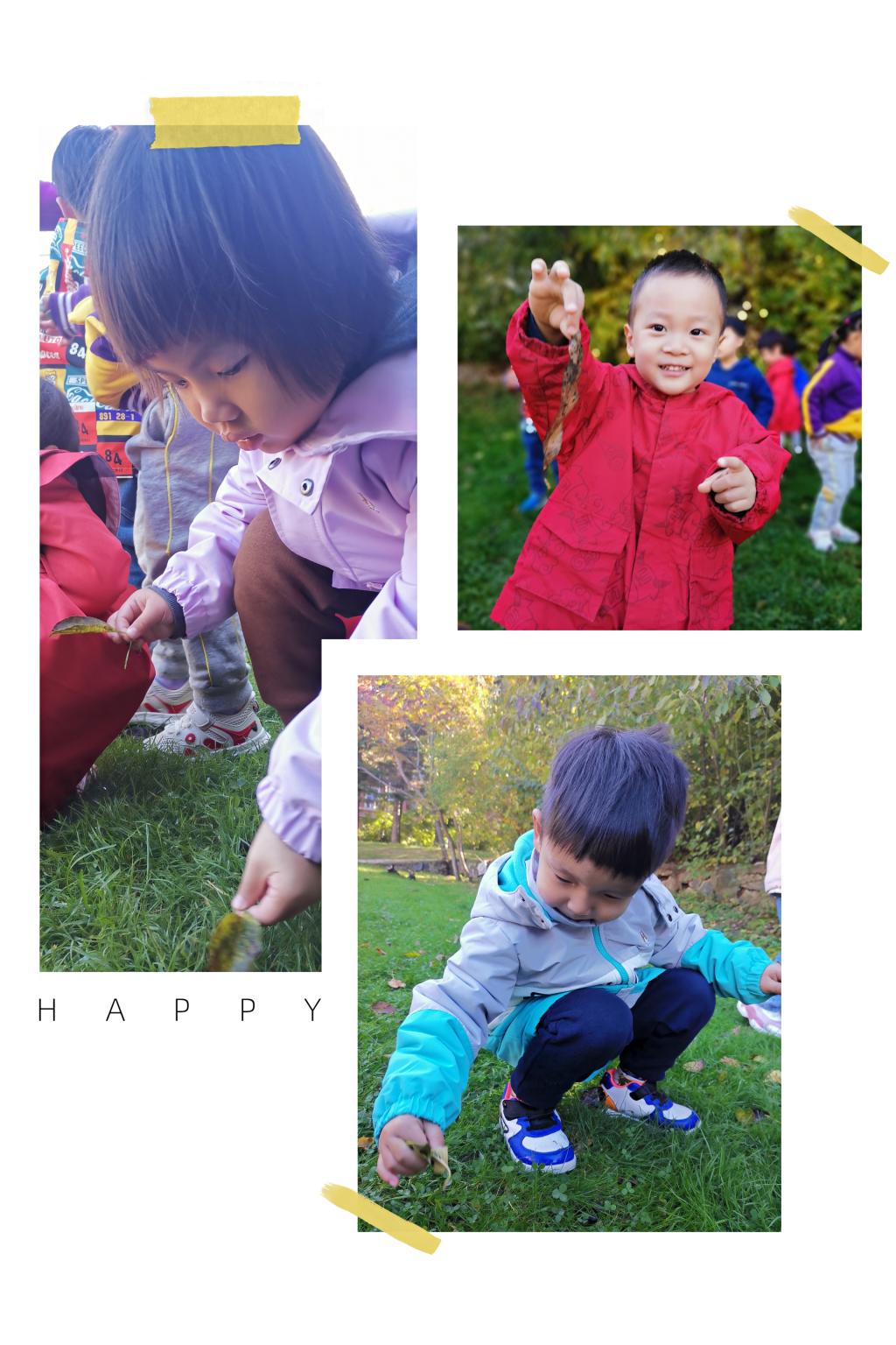 来到草地上,宝贝们被大自然的景色深深吸引住了。瞧!大家都认真起来,弯下腰,蹲下身,捡起这片树叶看一看,又捡起那片树叶看一看。