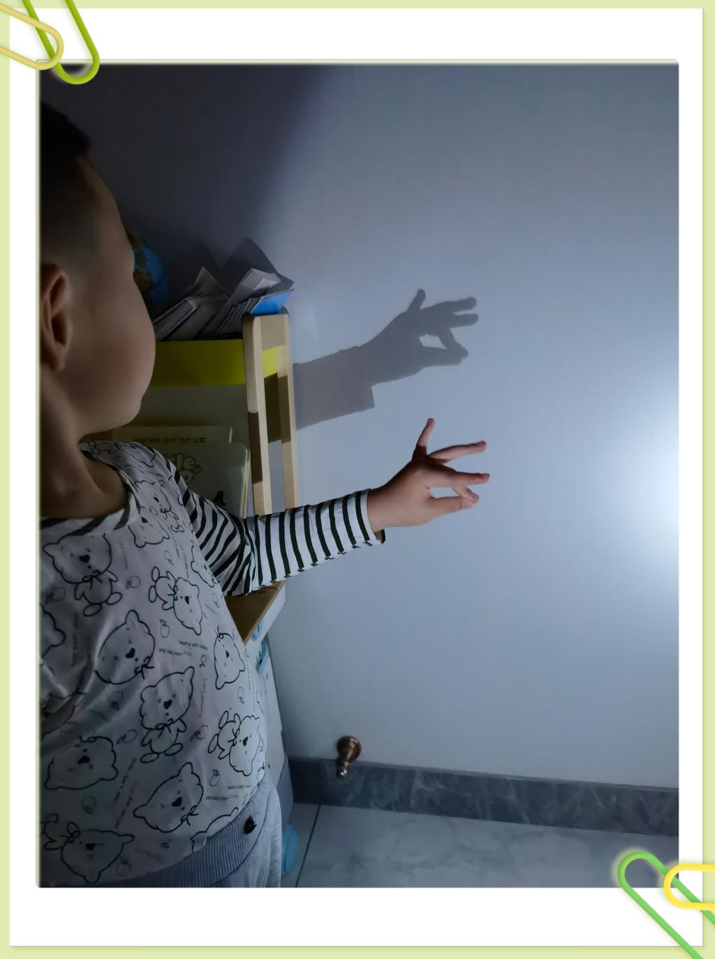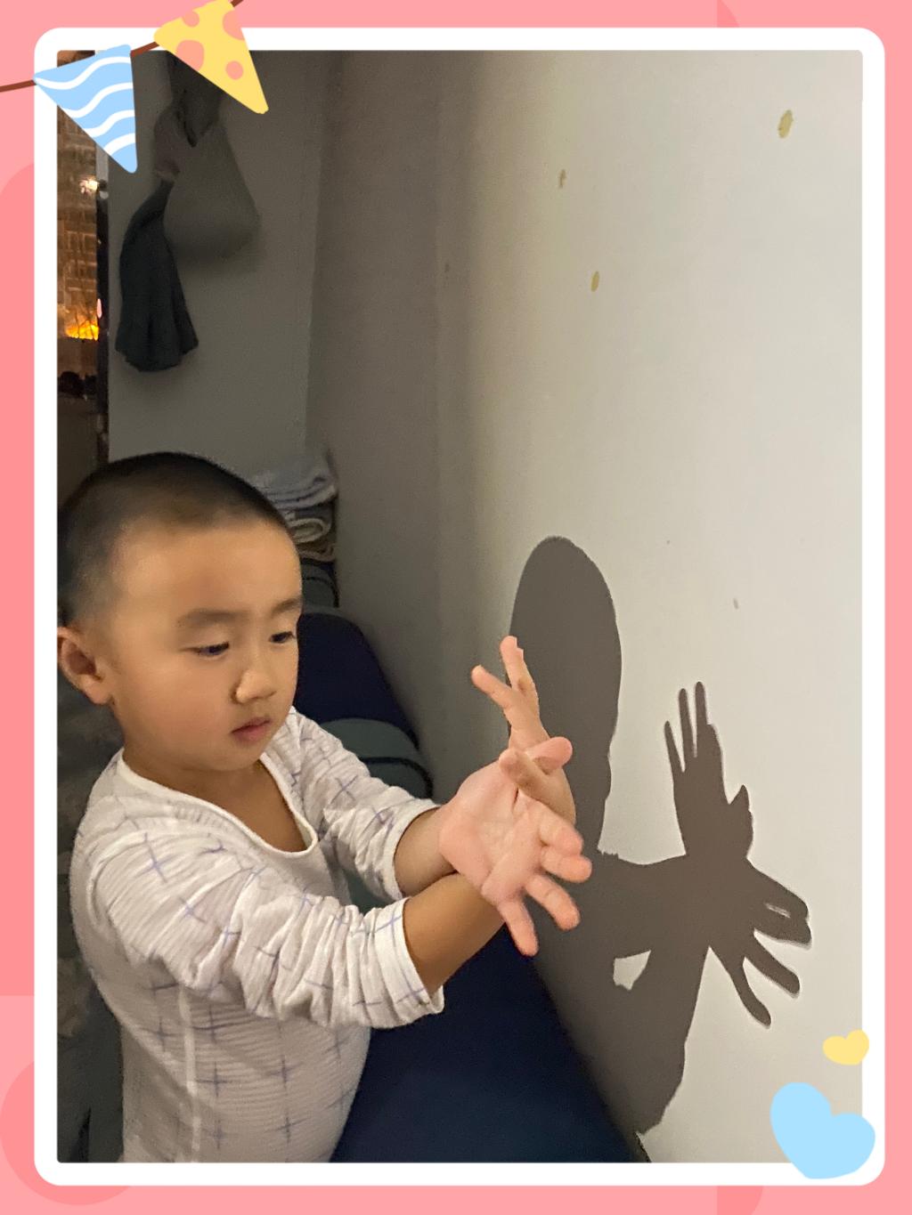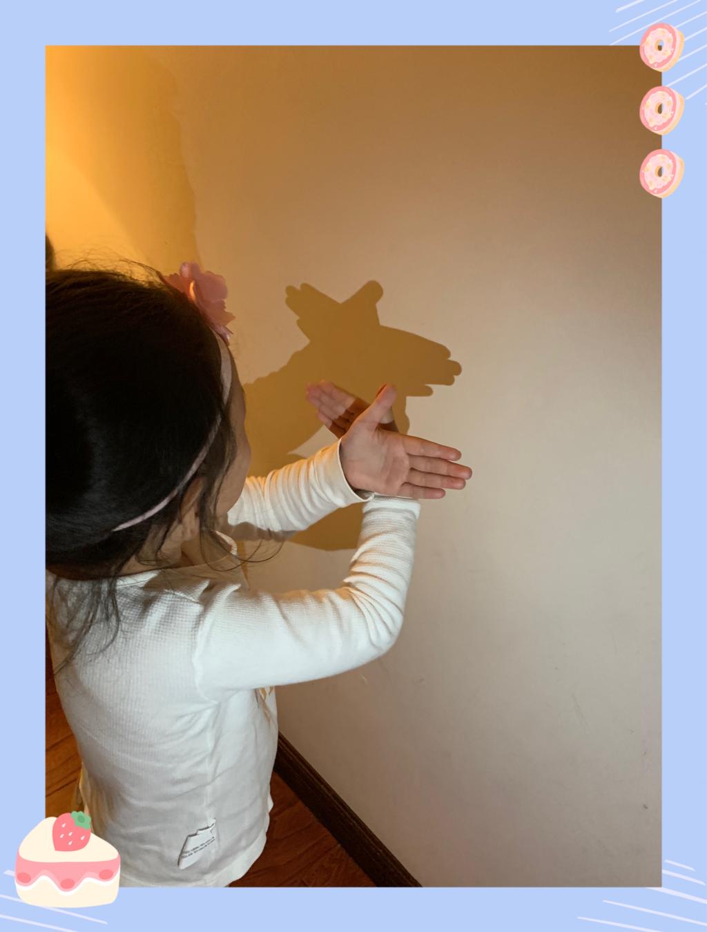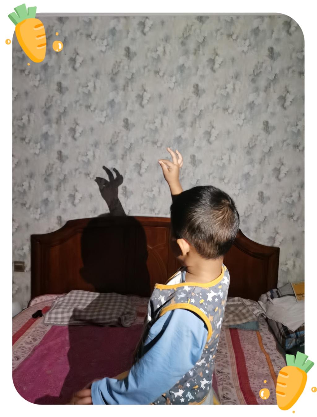 阳光下,影子与我们同行,在灯光下呢?能发现我们的影子吗?在家里,我们和爸爸妈妈也一起玩起了手影游戏哦!你们猜出来是什么了吗?
