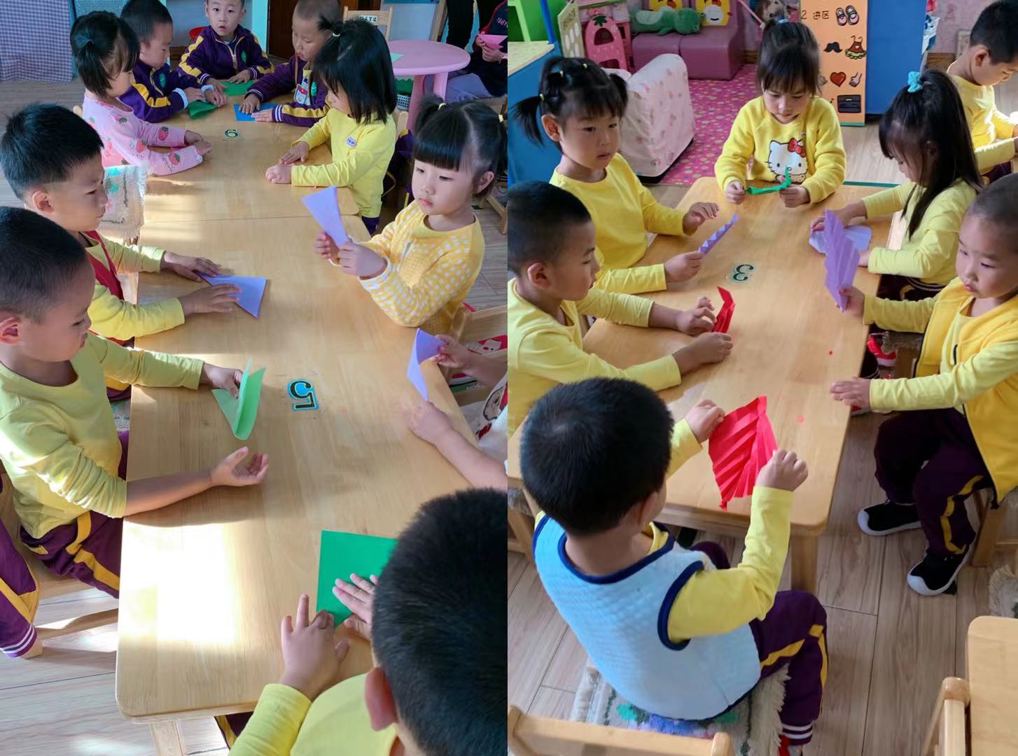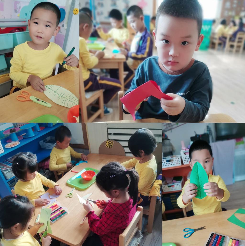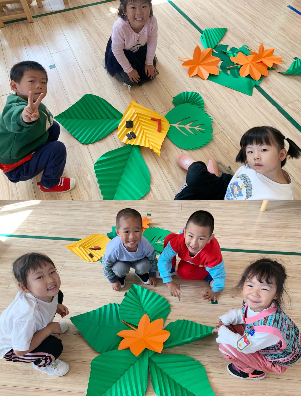 在老师的指导下,孩子们用五颜六色的彩纸,折出了立体的叶子先生。