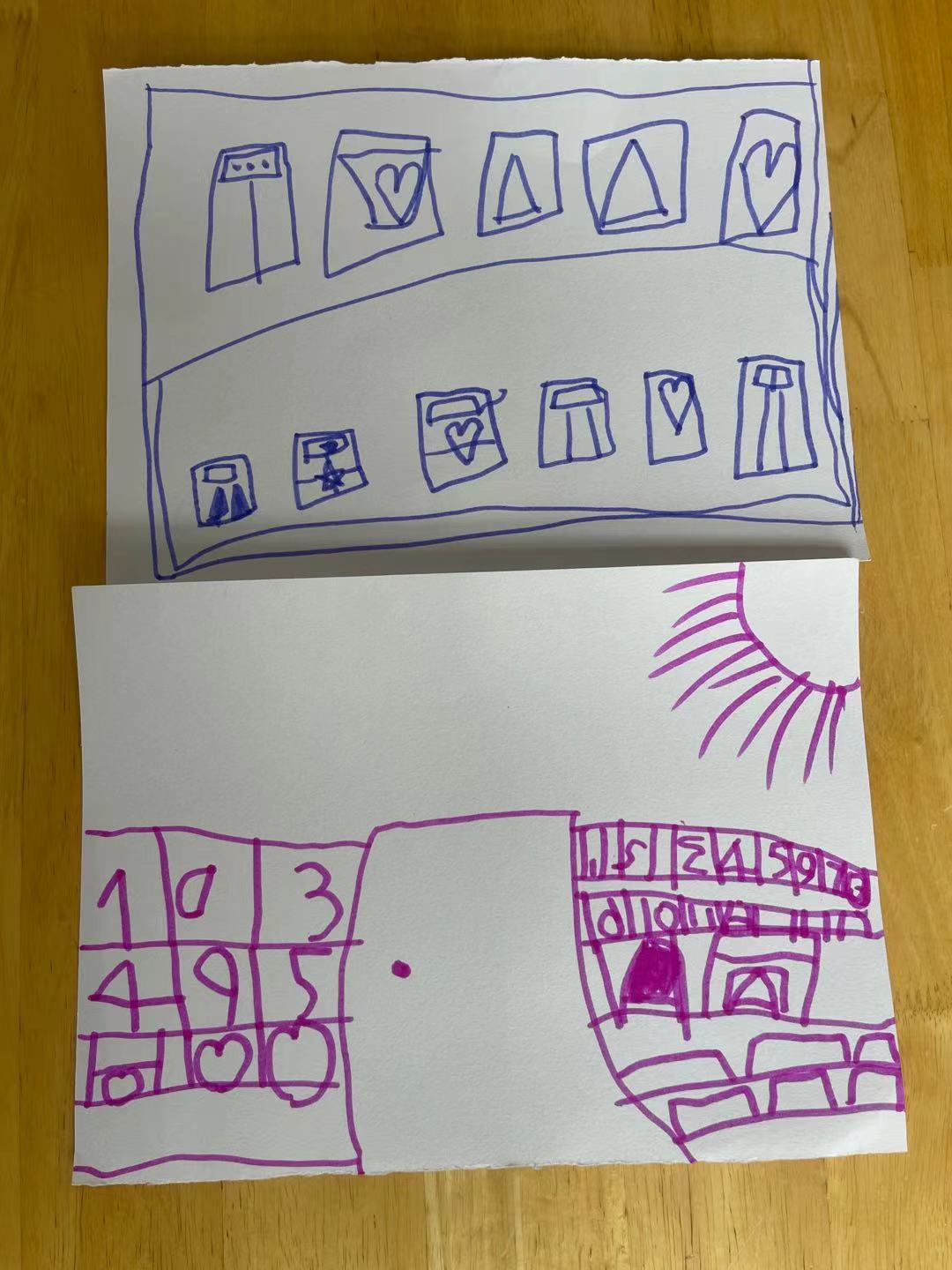 “图书馆会摆放着很多书架,有的书架上贴着各种图案,有的书架上贴着数字。”
