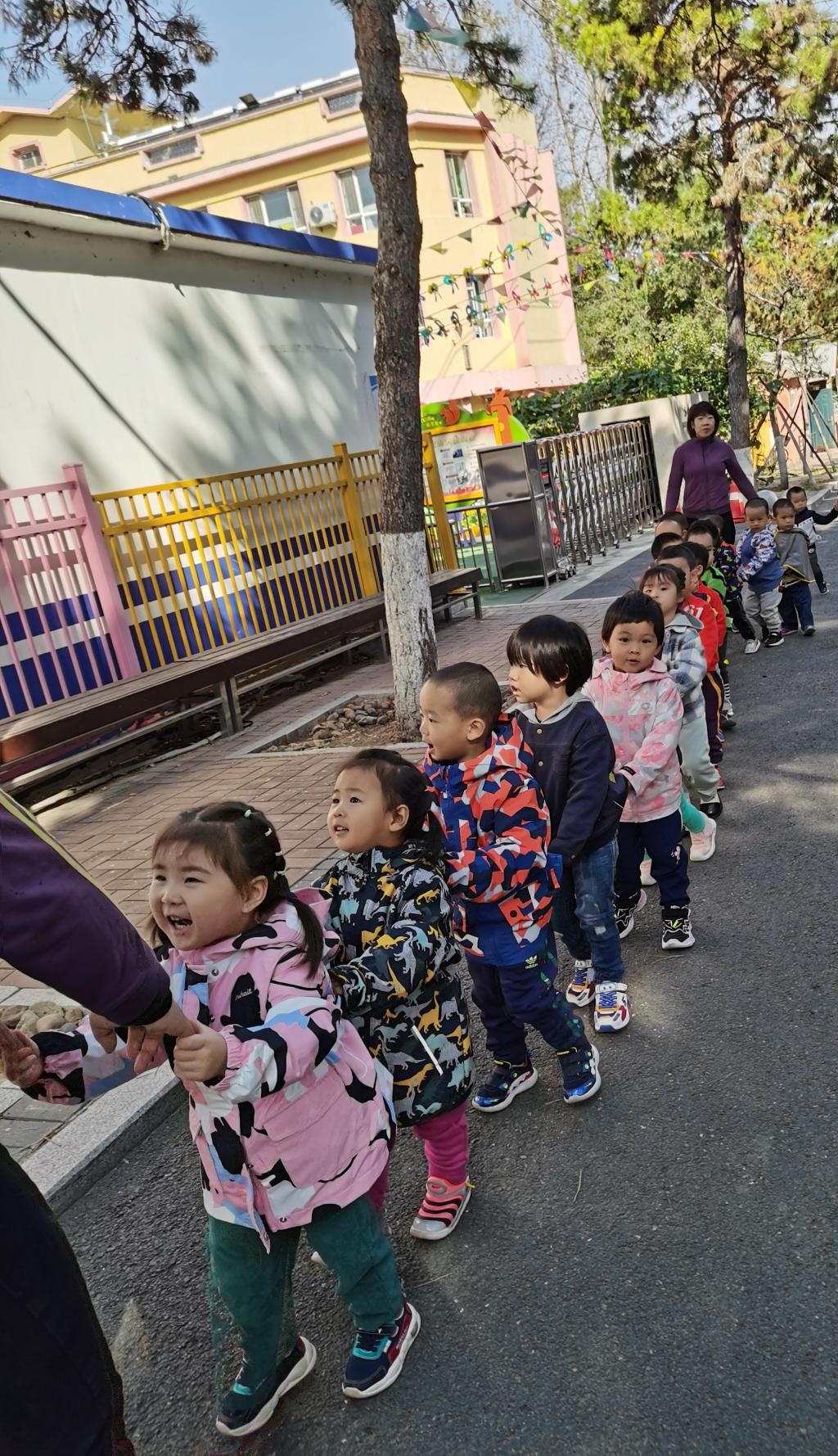 “老师,秋天有点冷。”“我看到树叶是黄色的。”“不对,树叶是绿色的。”“我想:树叶是五颜六色的。”伴着孩子们的童言稚语,豆豆三班的好奇宝贝拉起“小火车”,踏着秋风,迎着朝阳,走进了景色宜人的大自然,感知秋天、寻找秋天、收获秋天。