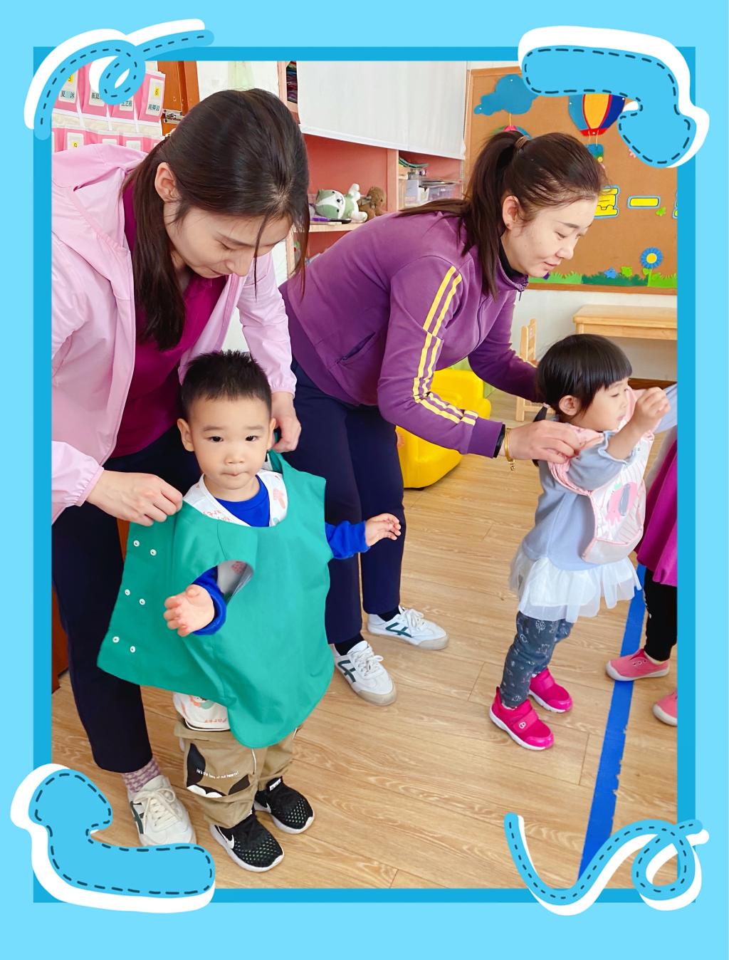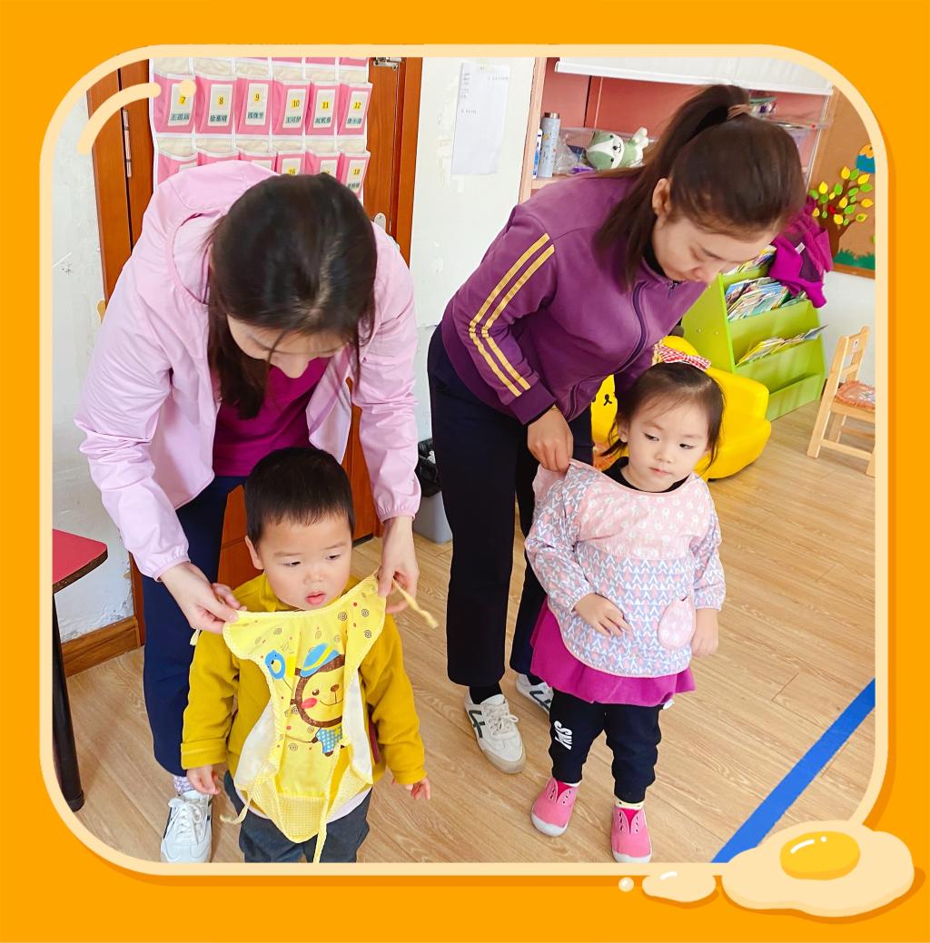 老师给我们穿围围,防止我们进餐的时候衣服被弄脏!