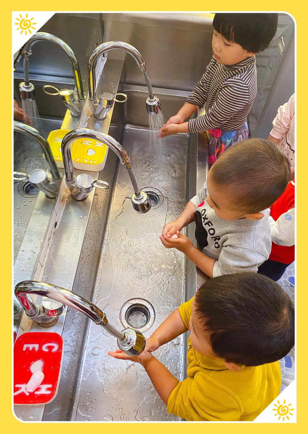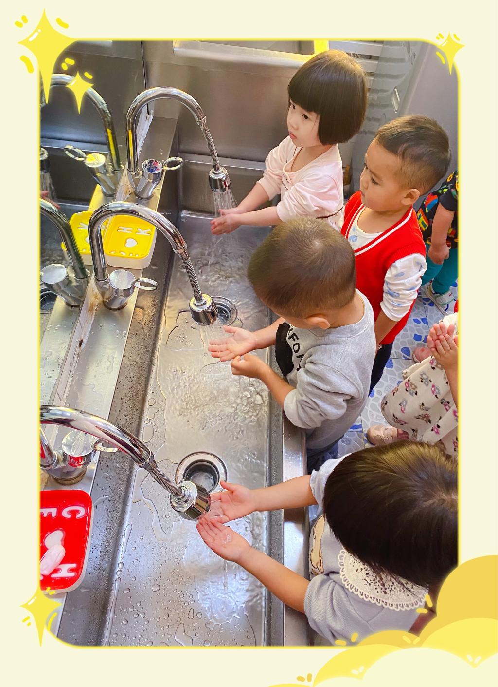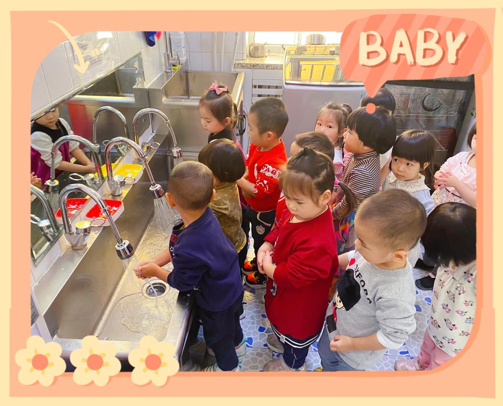 我们每天都要洗手,勤洗手是良好的卫生习惯。洗手可以洗掉手上的病菌免入口,避免感染生病。看看我们的小豆豆,有秩序的排好队,挽起袖子,洗手咯!