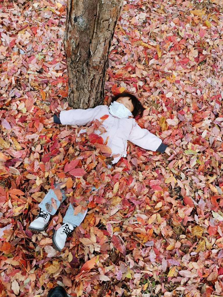 看一看枫叶,有的金灿灿,有的红彤彤。摸一摸树叶,有的粗糙,有的光滑。踩在落叶上,听到沙沙响。坐在落叶上,别提多松软了!