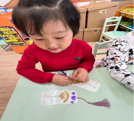 在卡纸上找到合适的位置均匀涂胶,粘上银杏叶,设计好自己喜欢的图案,写上自己的名字,老师用压膜机把我们设计的书签压好膜,就是为了让这枚书签使用时更方便,我们在书签的最上方用打孔器打好孔,系上漂亮的穗穗。