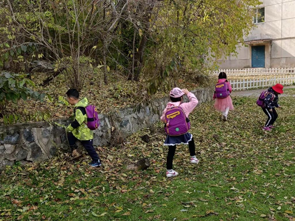 写生回来的路上,孩子们看到了校园里有很多漂亮的落叶。