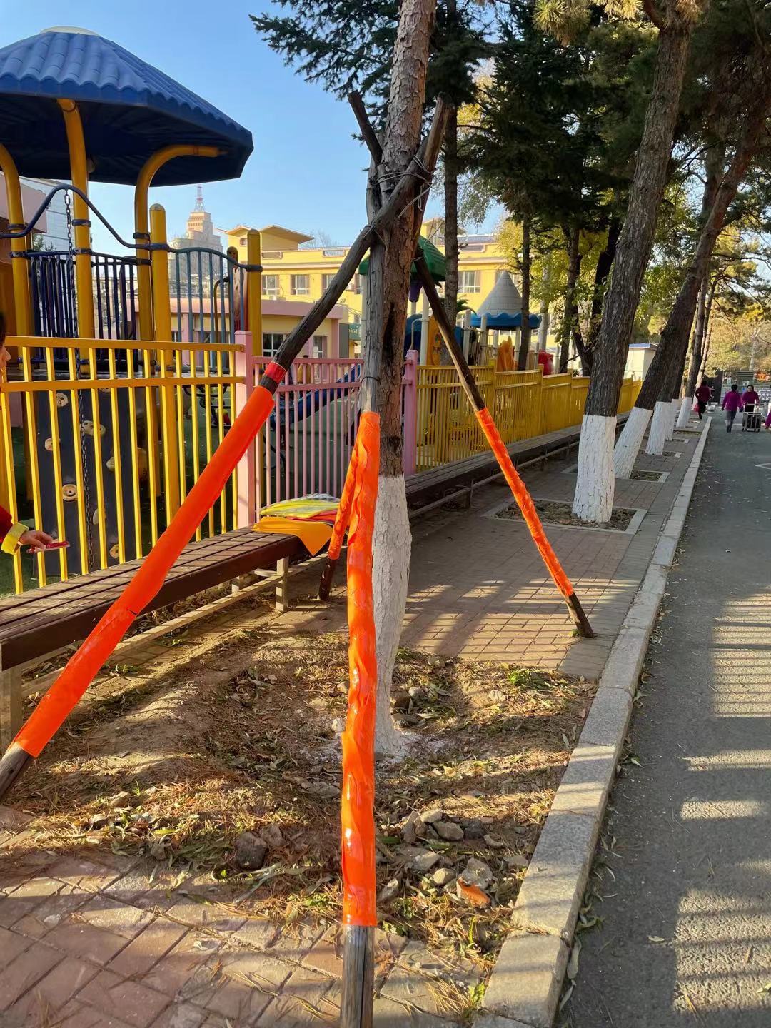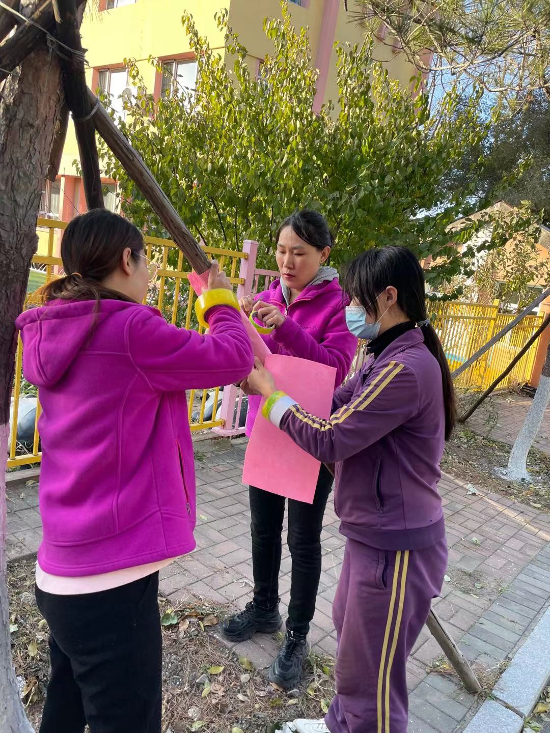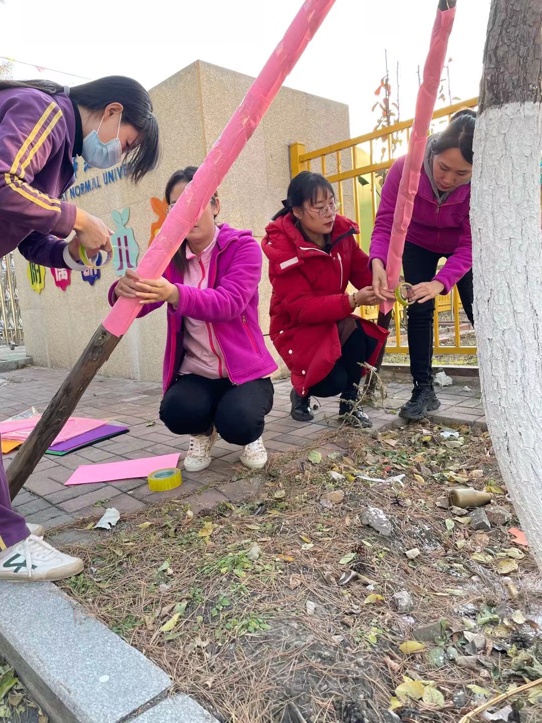 为了幼儿的安全,大家相互配合,很快便缠好了幼儿园栅栏外小朋友们经常遇到的木架。