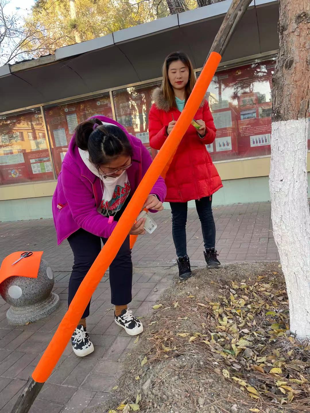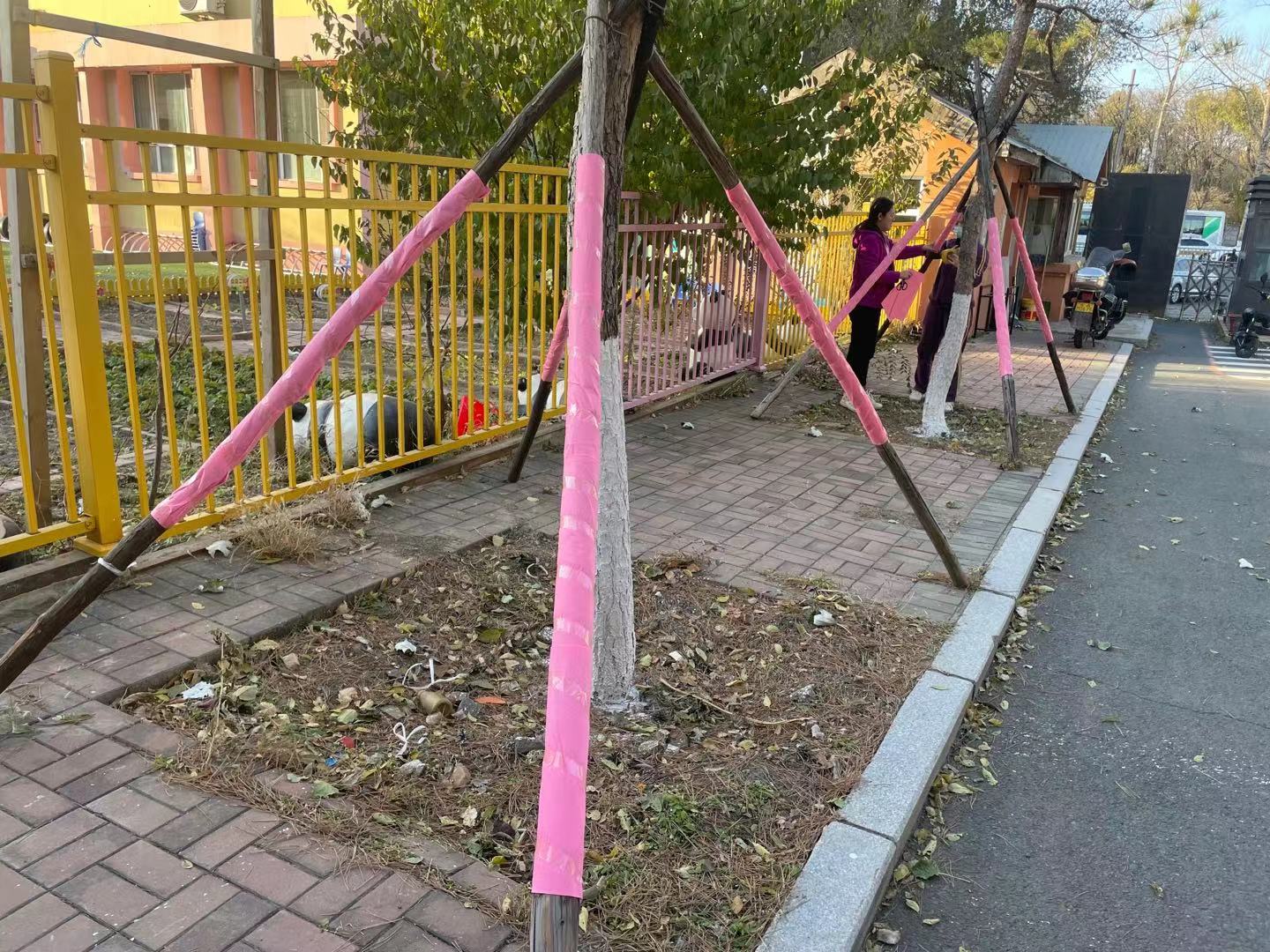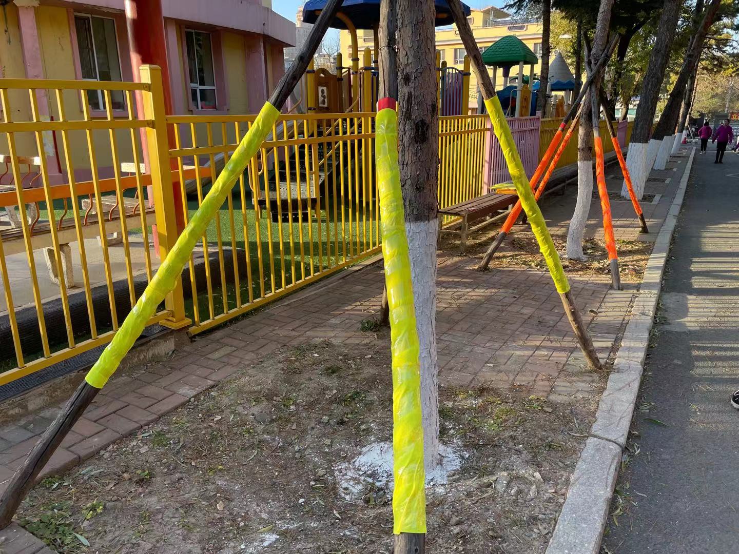 为了幼儿的安全,大家相互配合,很快便缠好了幼儿园栅栏外小朋友们经常遇到的木架。