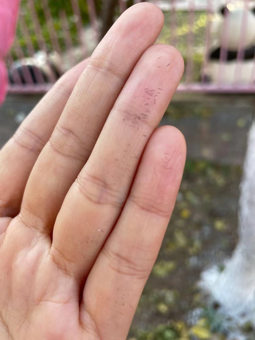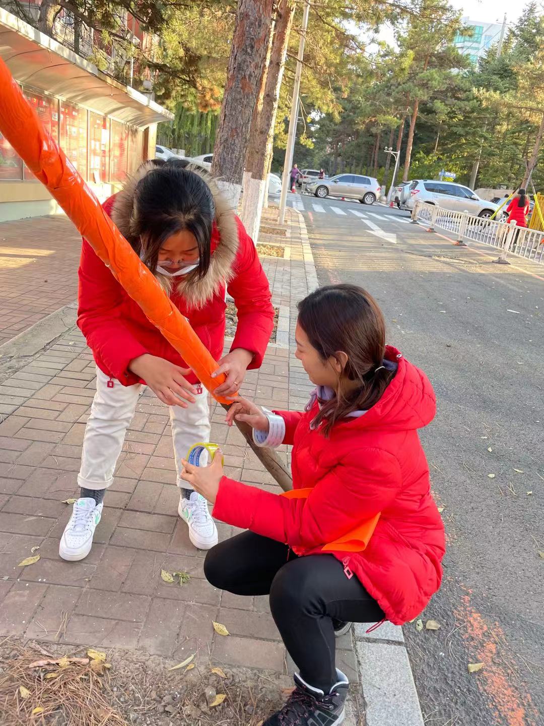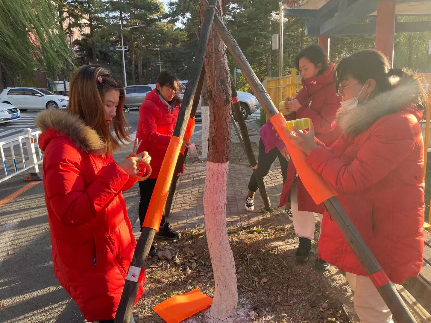 装饰木架的过程中,几位教师的手上也扎上了小刺,但是为了让孩子们每次的出行安全、温暖,大家忍着疼痛,坚持完成了工作。