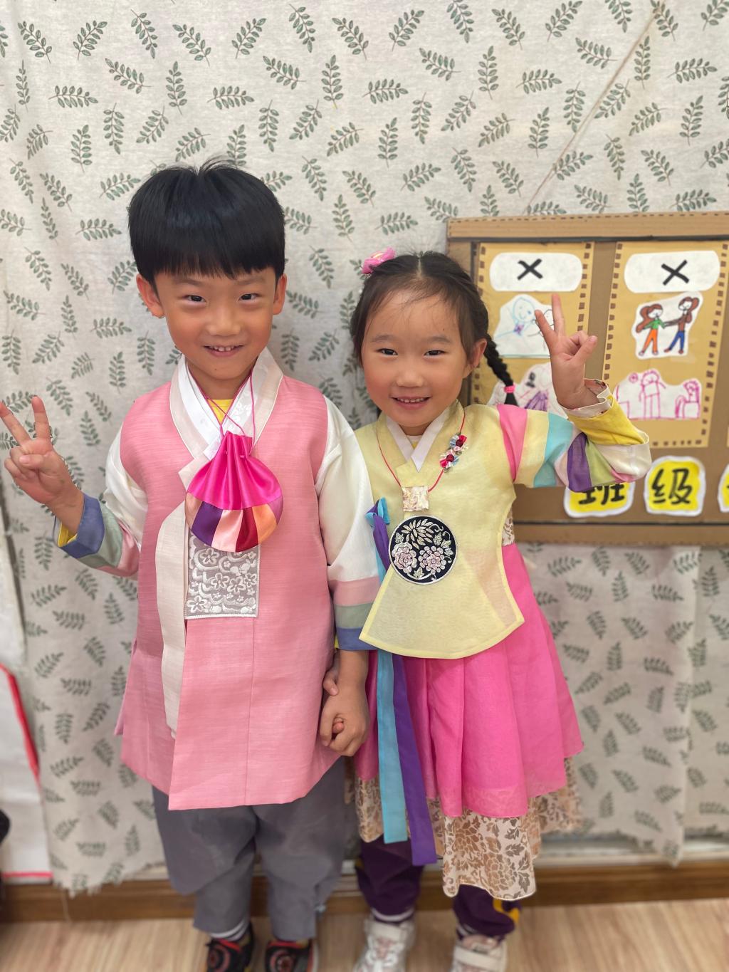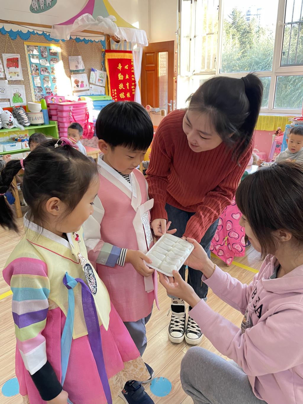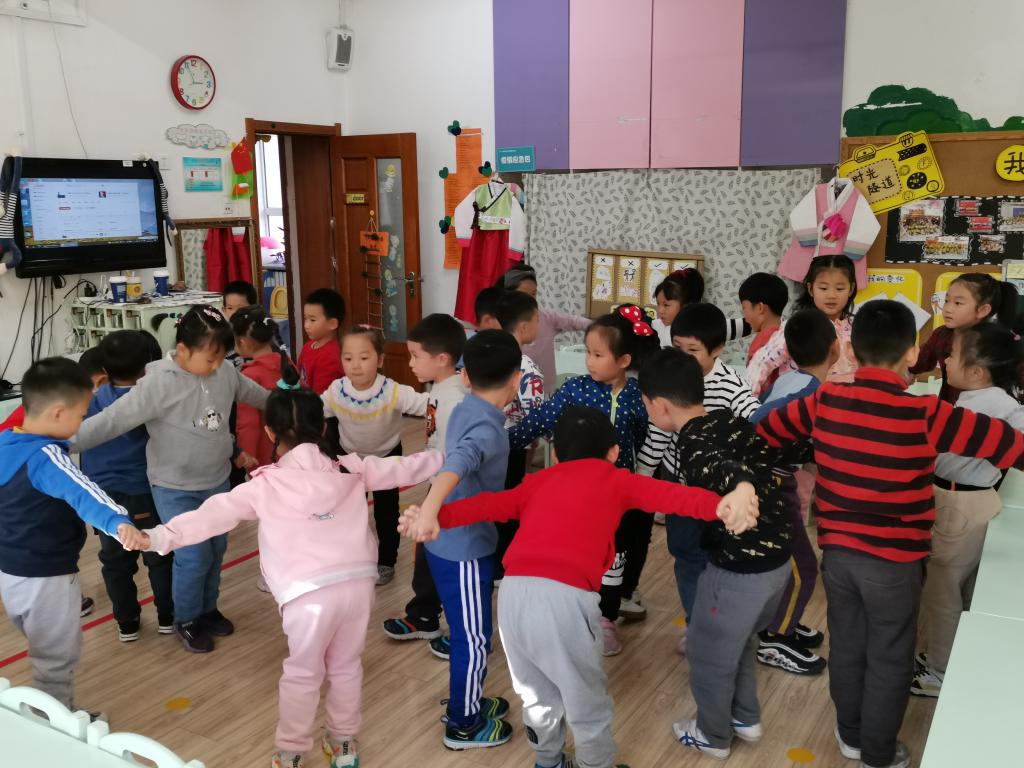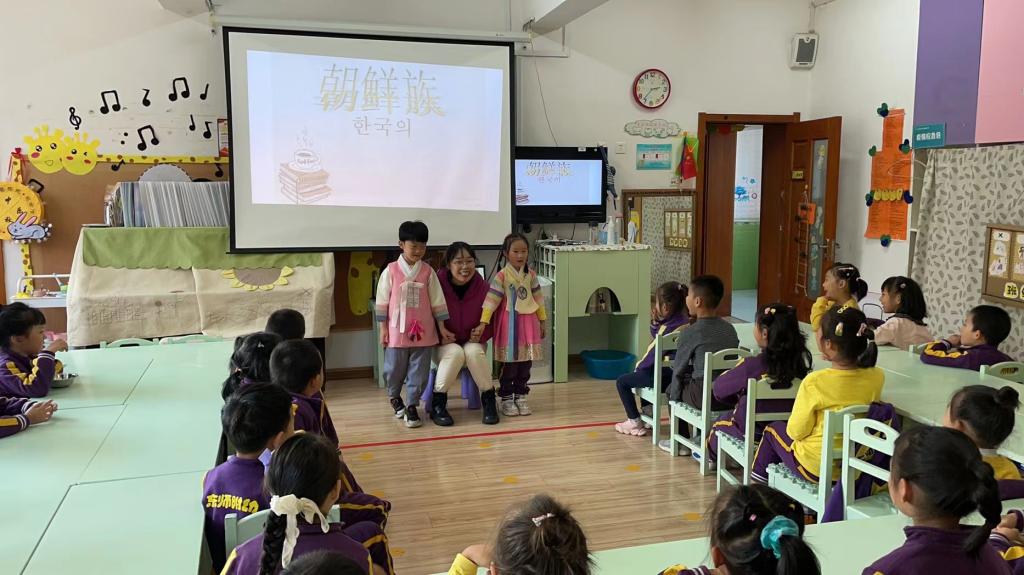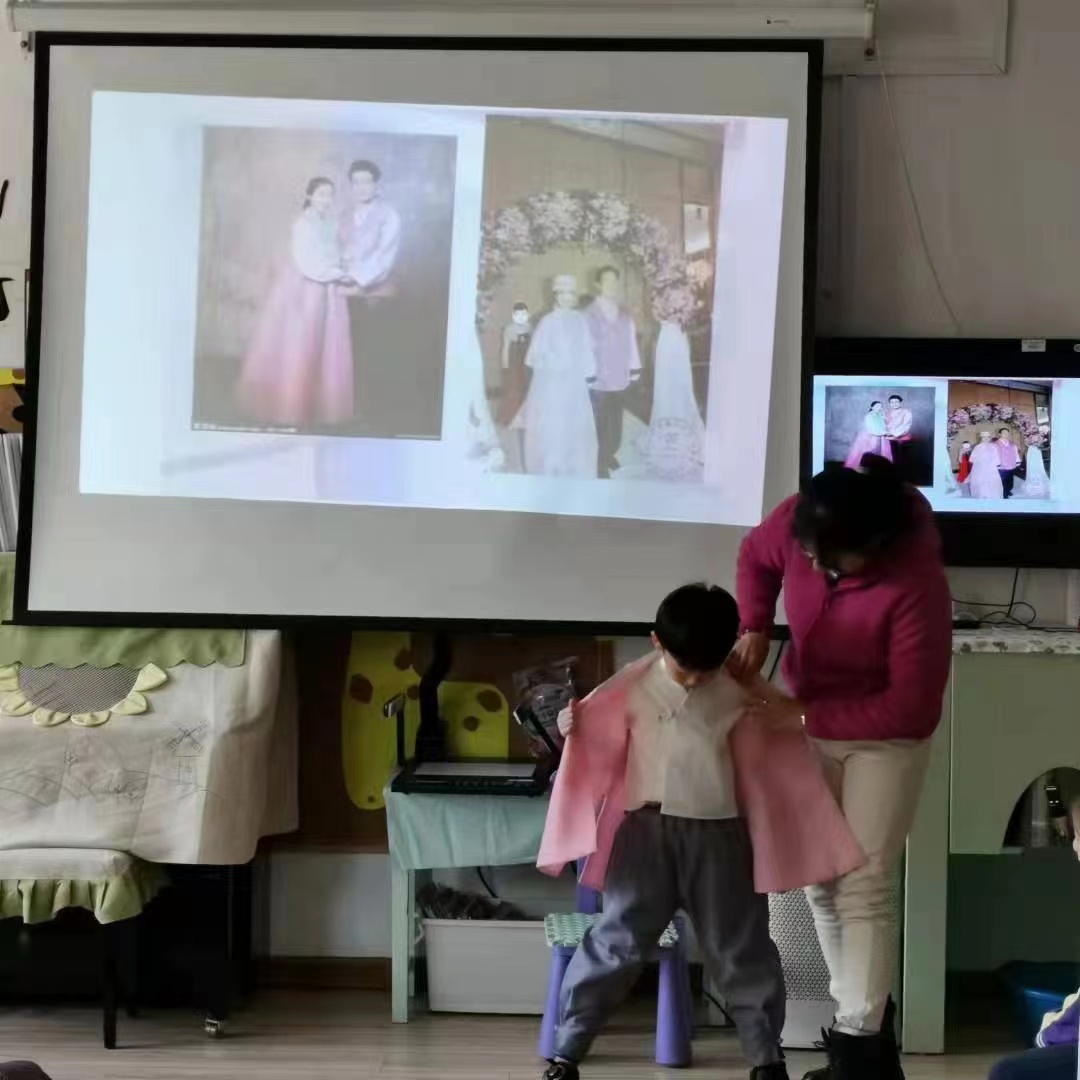 朝鲜族是一个能歌善舞的民族。班级里恰巧有两名朝鲜族的小朋友,以此为切入点,老师们结合多媒体课件、绘本,引导孩子们了解朝鲜族的文化和习俗,增进幼儿对朝鲜族的了解。这两名朝鲜族的小朋友还带来了本民族的服饰,他们穿戴好之后为小朋友们展示了朝鲜族服饰,孩子们充分的感受到朝鲜族文化特色。