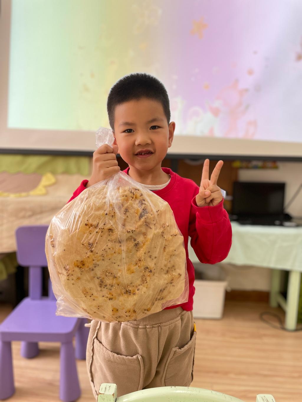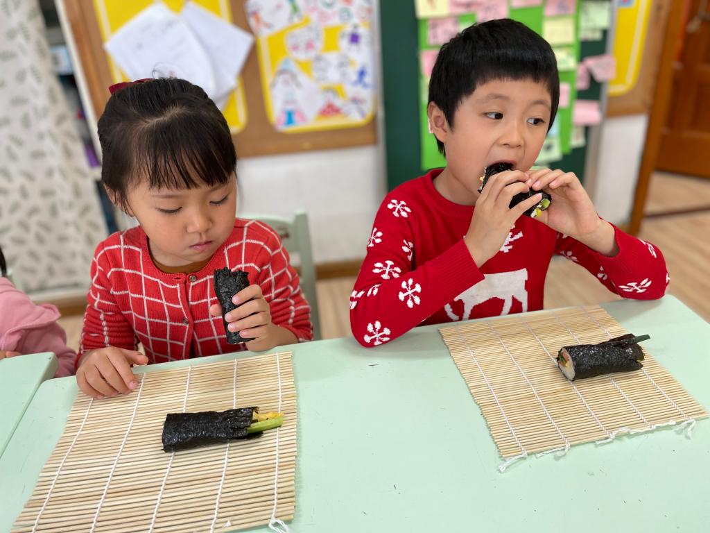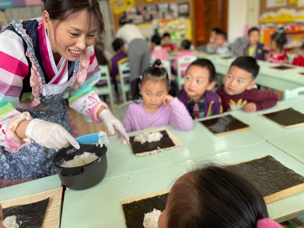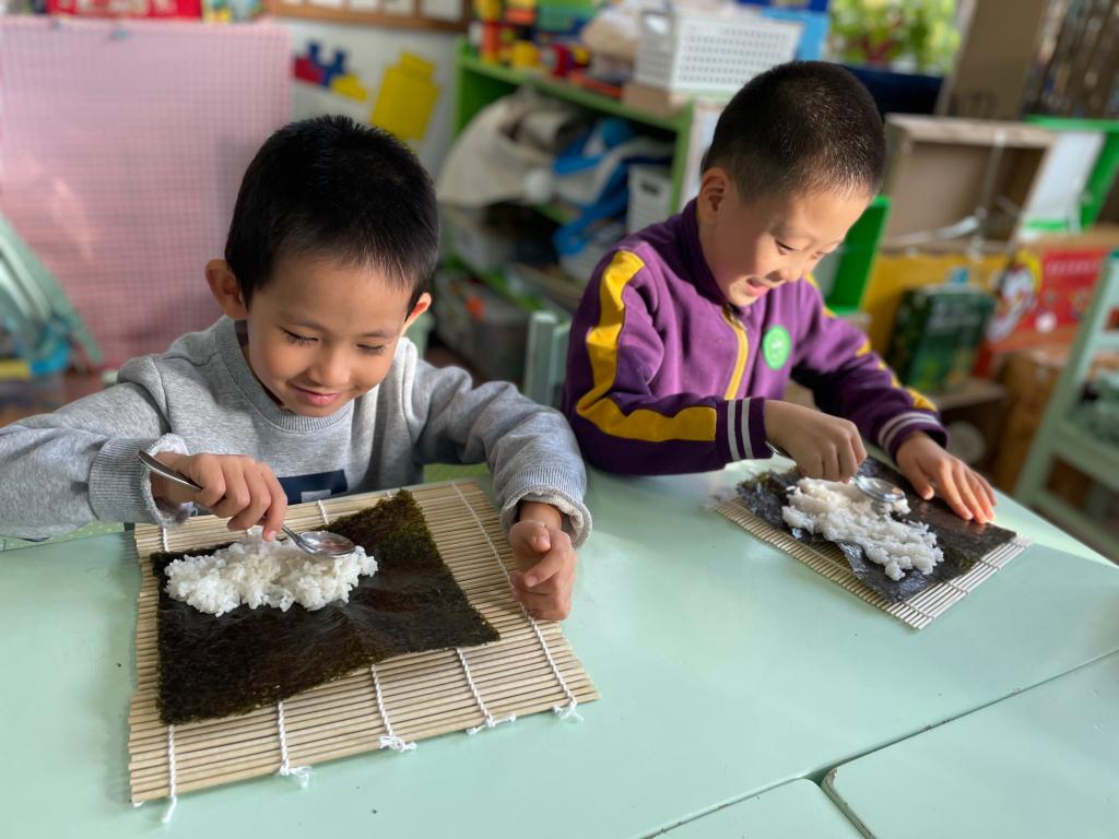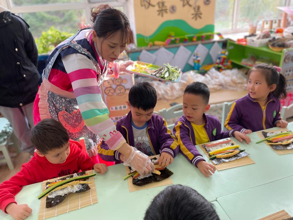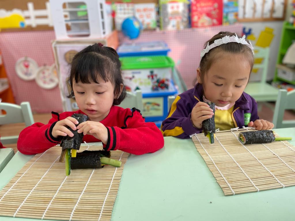 朝鲜族人平时特别喜欢吃大米饭,而且用米饭、紫菜、胡萝卜、黄瓜,以及其他配料制成的紫菜包饭,在他们的日常饮食中也比较多见。姜亦善小朋友的妈妈也来到班级指导小朋友们制作地道的紫菜包饭。“薄薄的紫菜怎么样和白白的米饭、黄瓜、胡萝卜、火腿肠包在一起呢?”到亲自实践的时间啦!小朋友们个个变身成了小厨师。