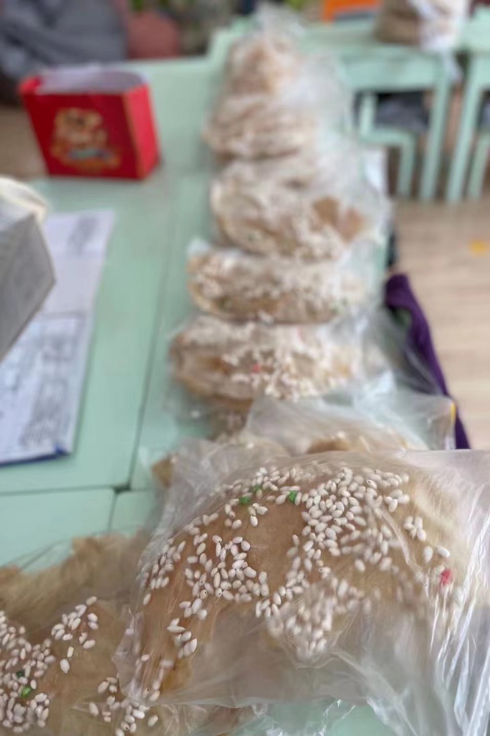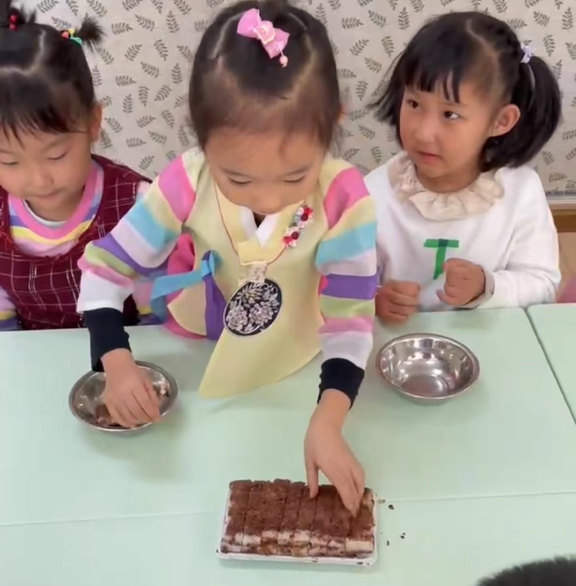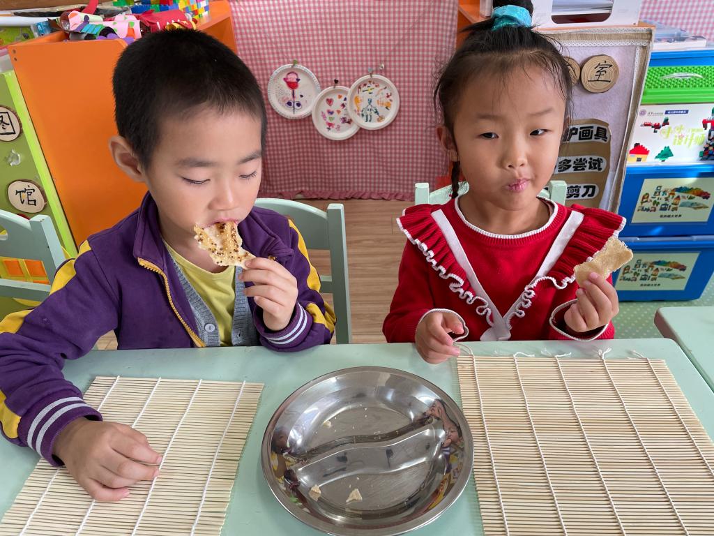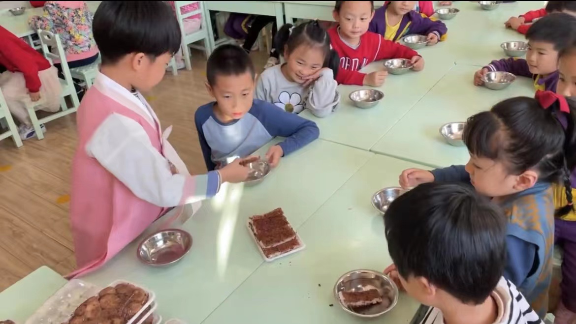 金禹辰小朋友和李勃希小朋友给小朋友们带来的朝鲜族美食有米糕、粘糕、月亮糕、挂珠粒。小朋友们通过品尝美食,了解朝鲜族文化。他们分享美食、品尝美食。