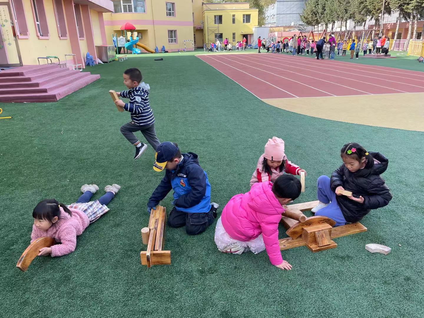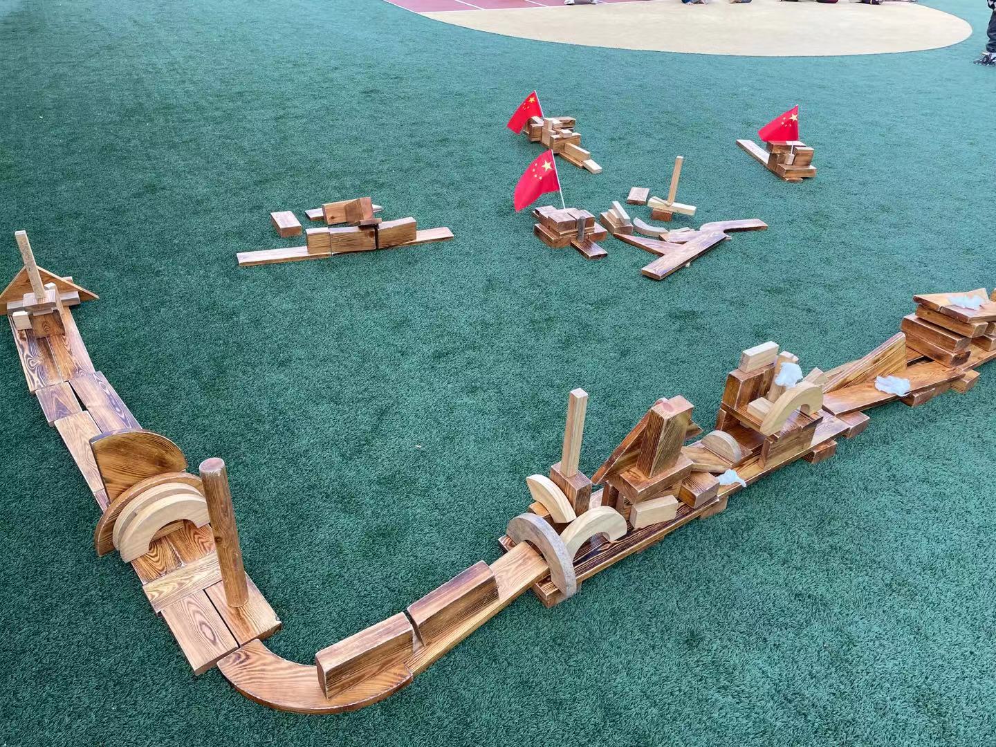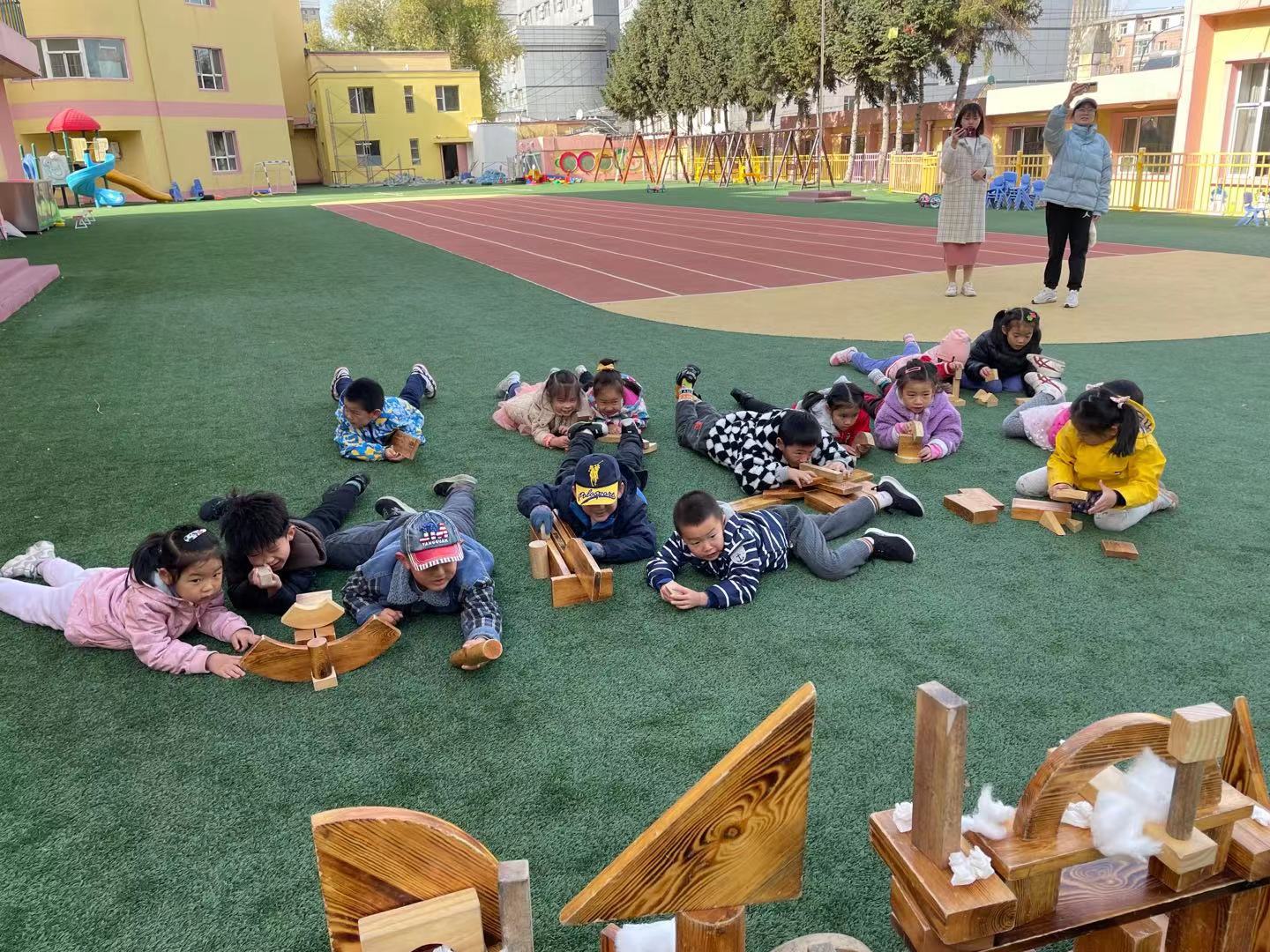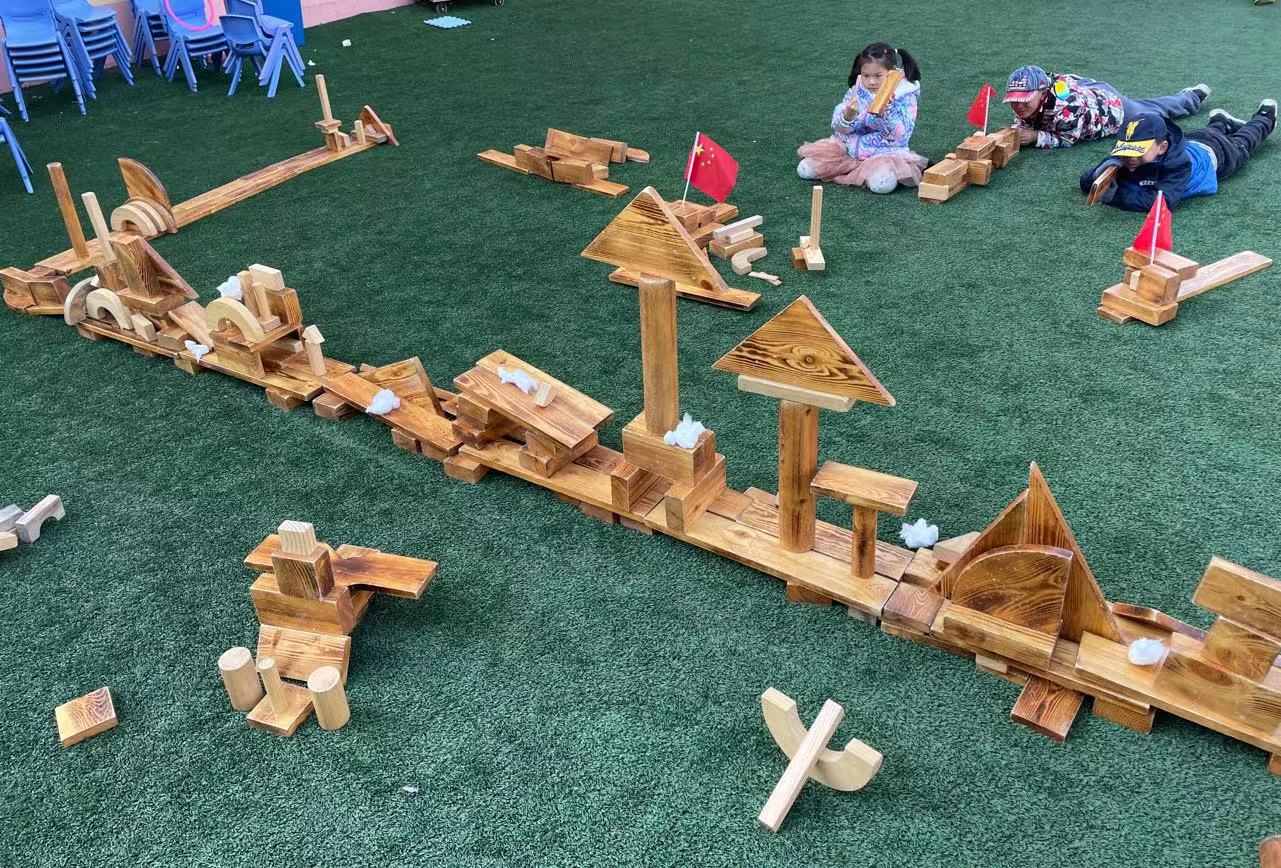 在经过初步的方案设计与讨论之后,孩子们提出在户外建构“长津湖之战”!在幼儿园的操场上,孩子们新的建构开始了。
