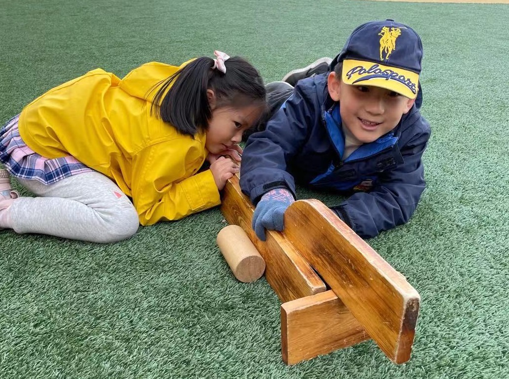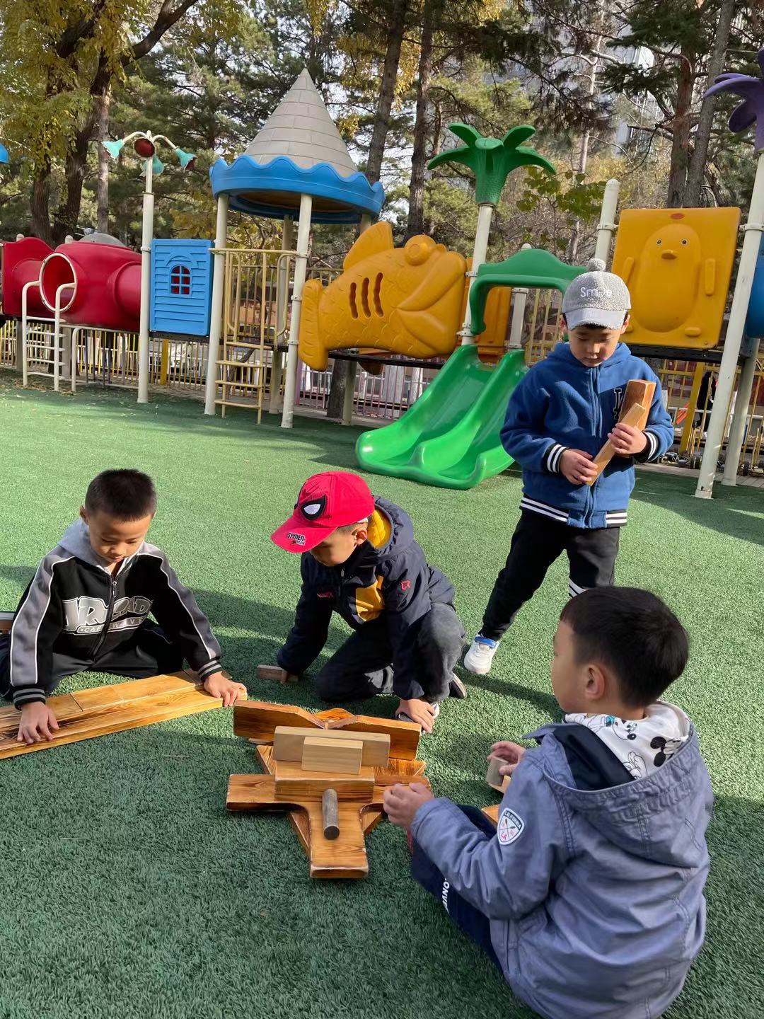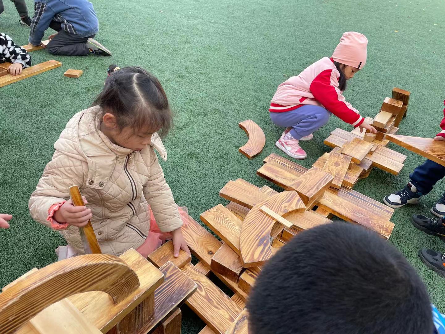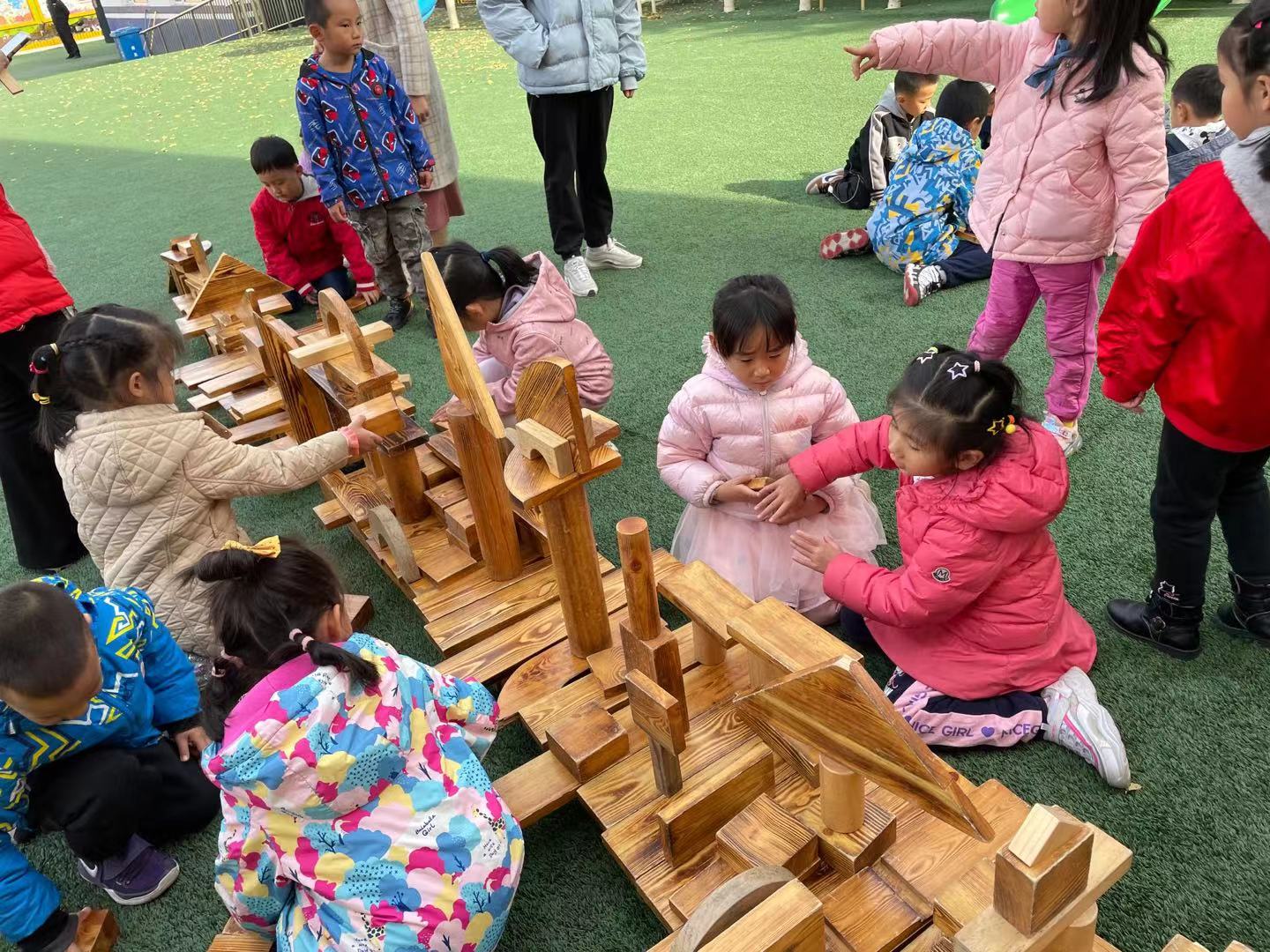 在经过初步的方案设计与讨论之后,孩子们提出在户外建构“长津湖之战”!在幼儿园的操场上,孩子们新的建构开始了。