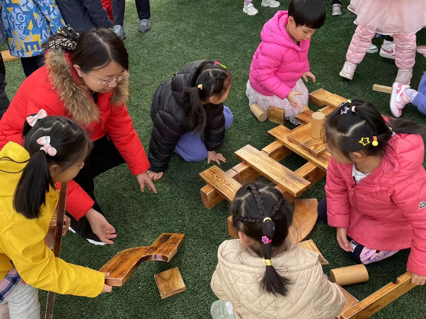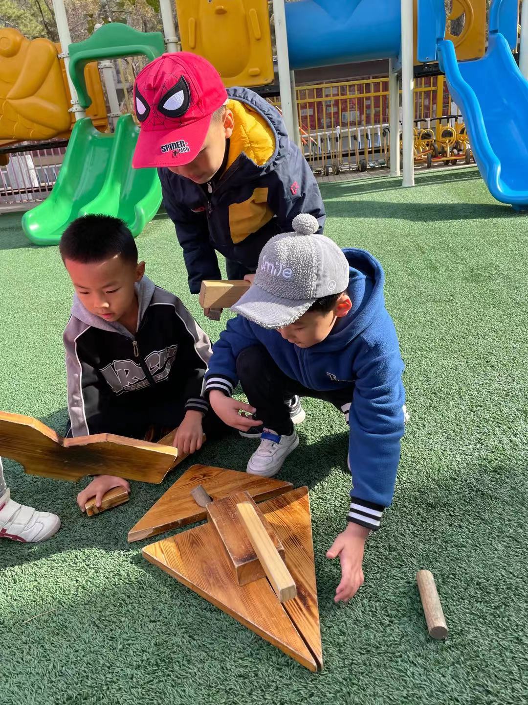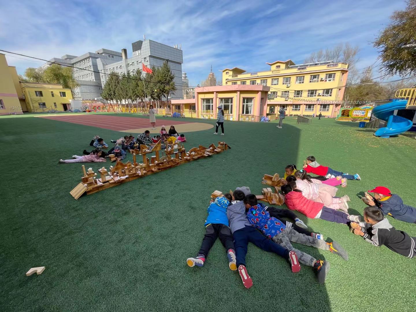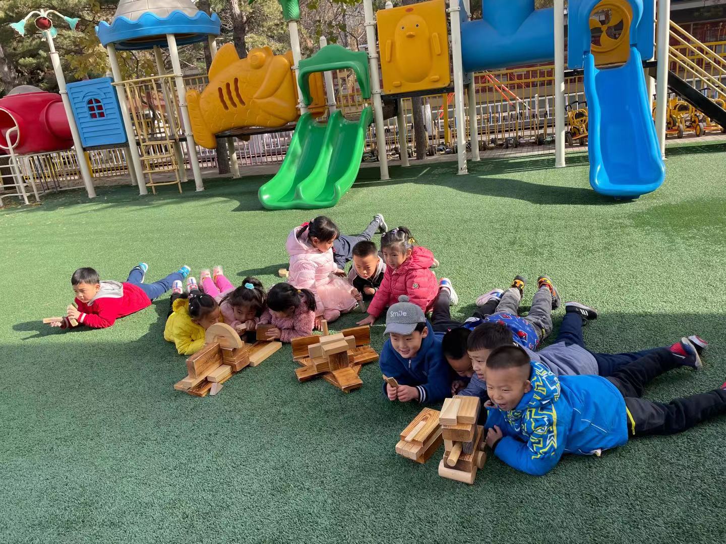在经过初步的方案设计与讨论之后,孩子们提出在户外建构“长津湖之战”!在幼儿园的操场上,孩子们新的建构开始了。