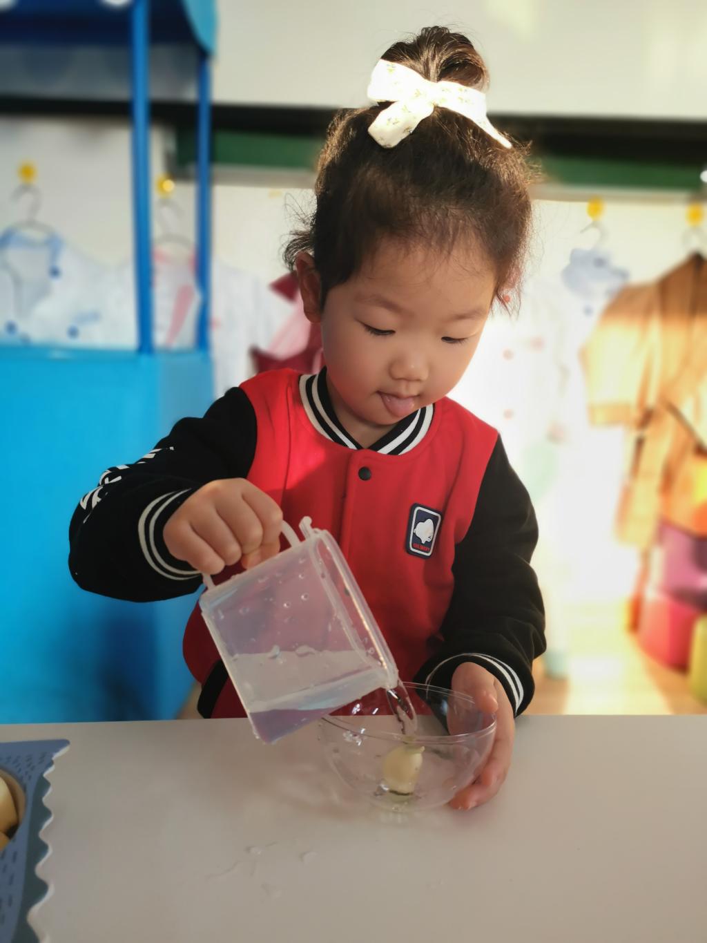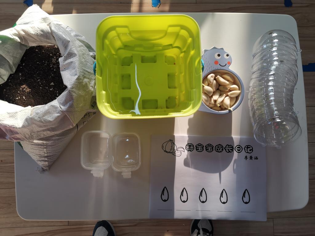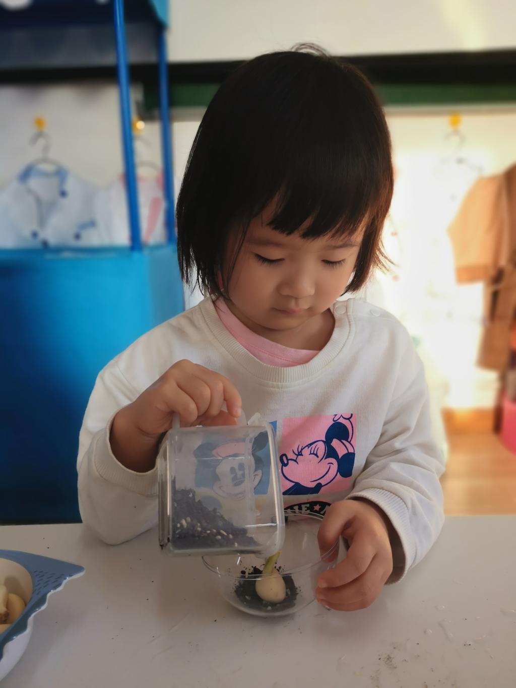 通过之前的了解,宝贝们对蒜宝宝的探究热情只增不减,于是宝贝们亲手种植蒜宝宝的活动开始啦!