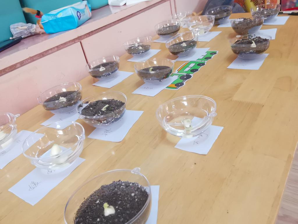 有的宝贝选择土培的方式,他们在容器里铺上一层土,然后小心翼翼的将事先剥好皮的蒜宝宝插进土里。