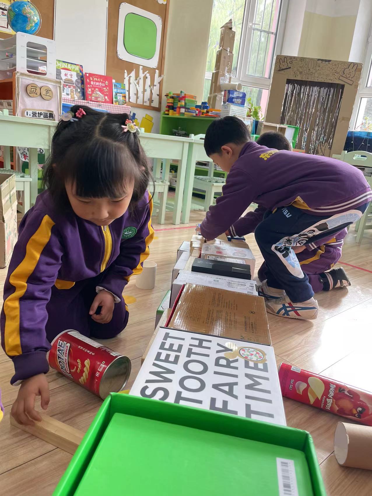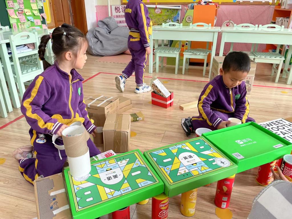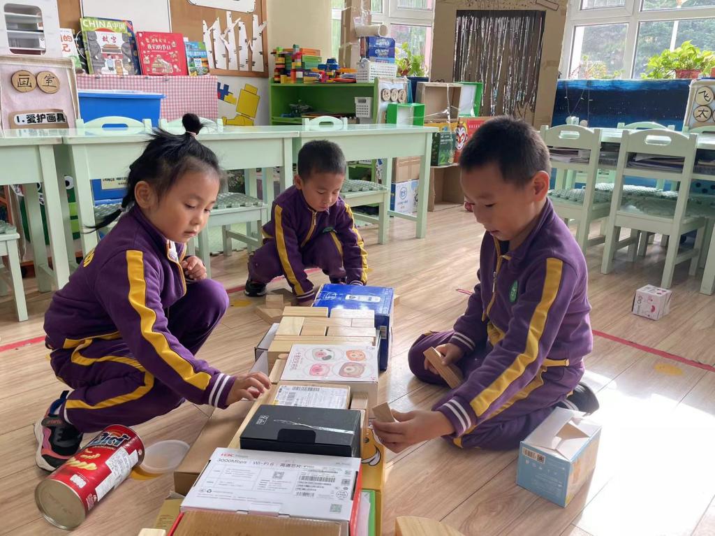 通过前两次的游戏,大家想试试用班级中收集到的纸盒,能不能建构一座坚固的桥。经过数量清点,孩子们发现纸箱的数量不够,而且需要圆柱形的东西做桥墩。于是大家经过头脑风暴,想出家里有的材料,进行整合,第二天带到幼儿园来。