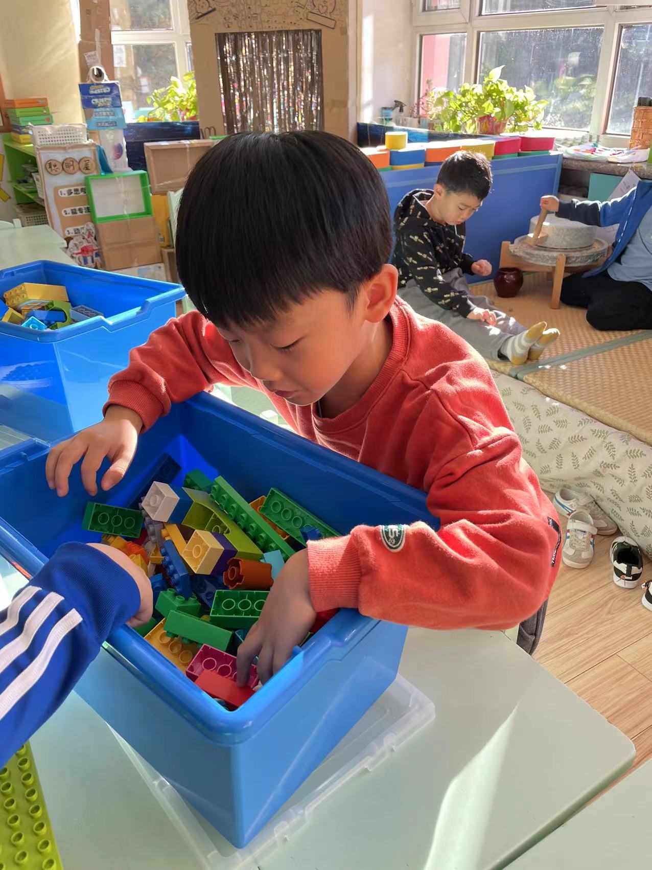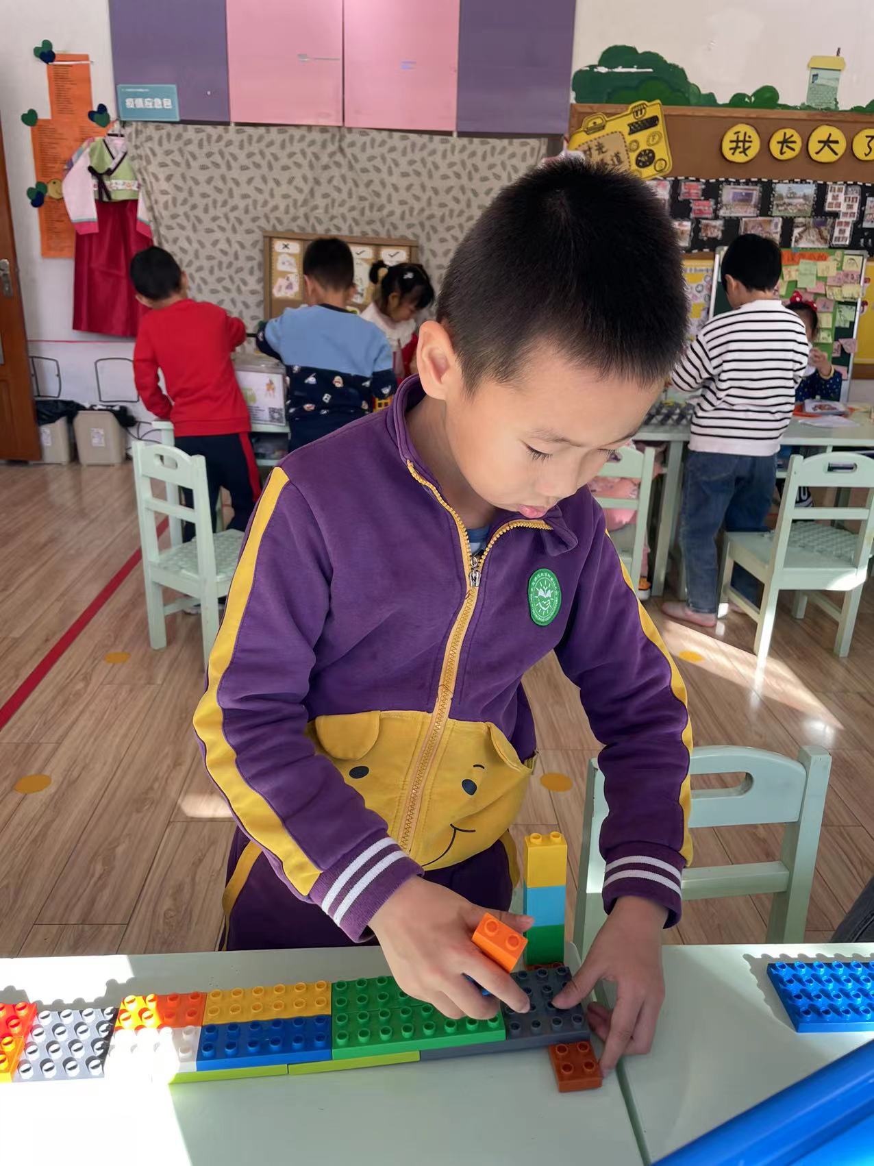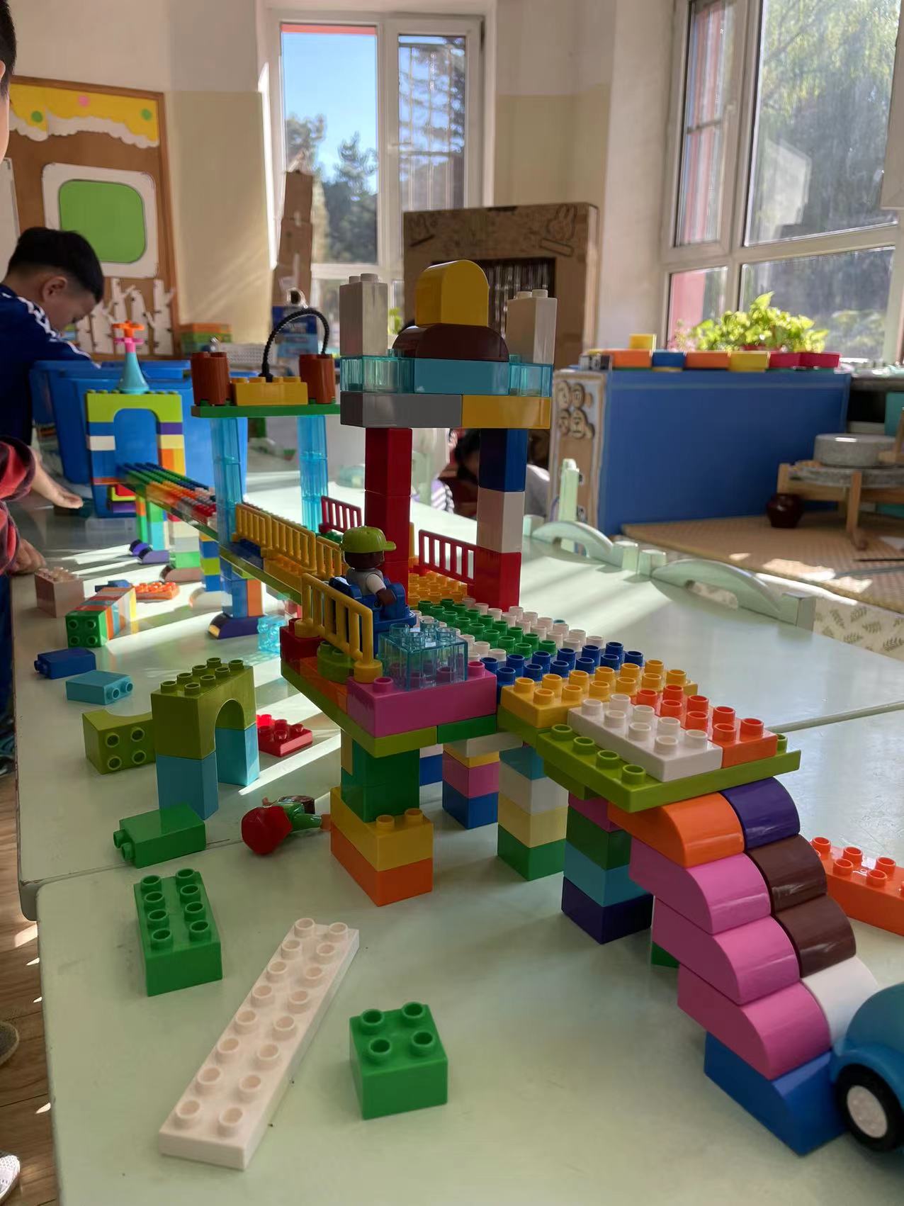 区域游戏的时候,孩子们继续用乐高积木探索建构坚固的桥梁。两组小朋友分别设计了图纸,然后用围合、搭高、拼插、对称等方法进行建构。