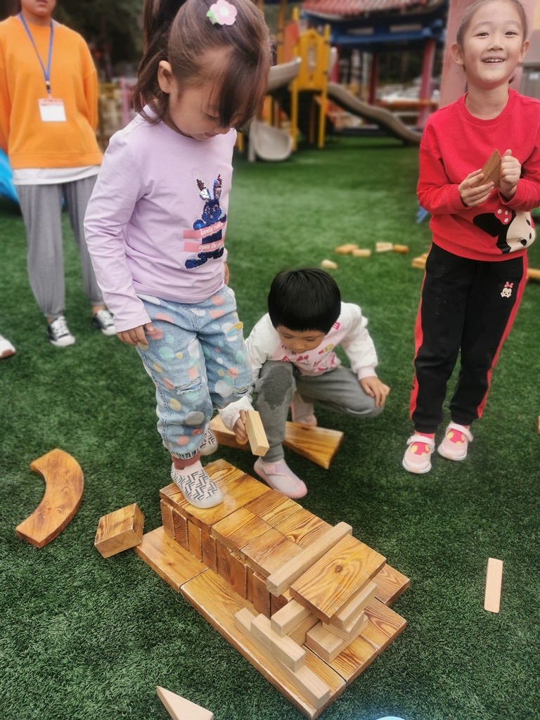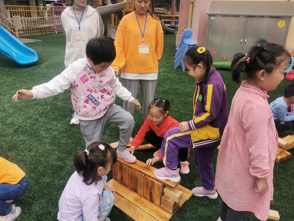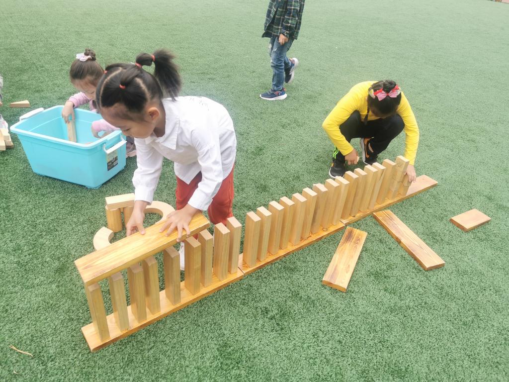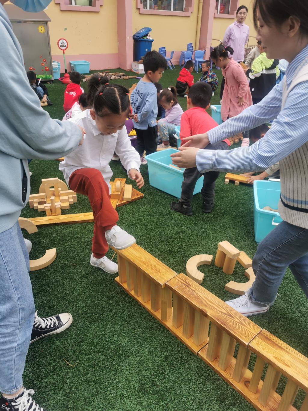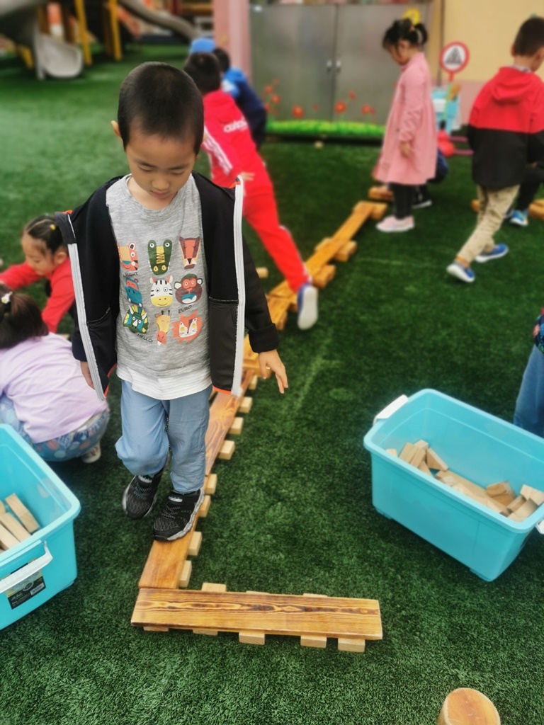 户外游戏的时候,大家用碳化积木,分组建构出一座座独木桥。