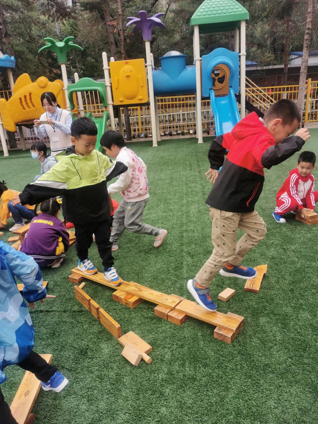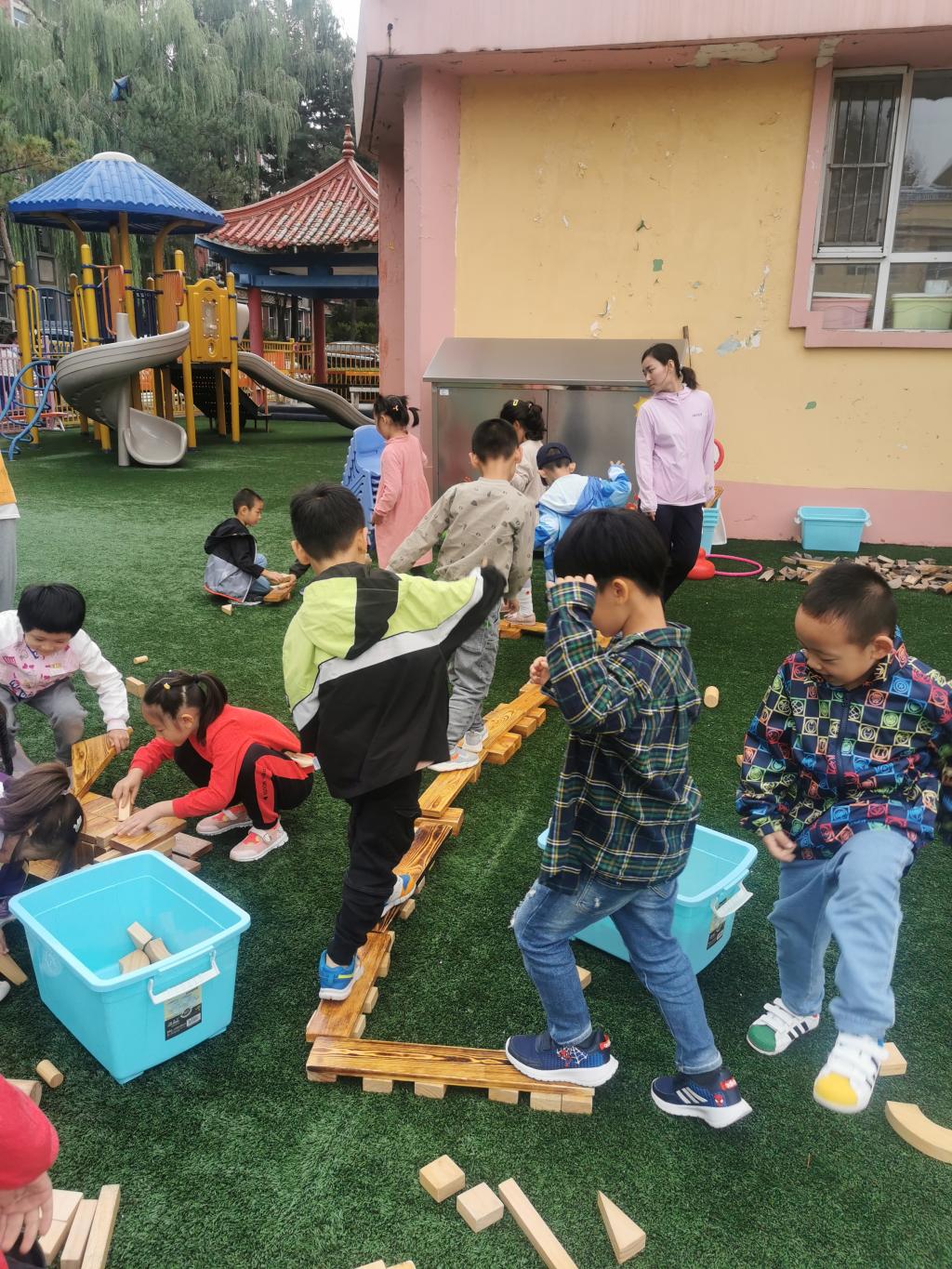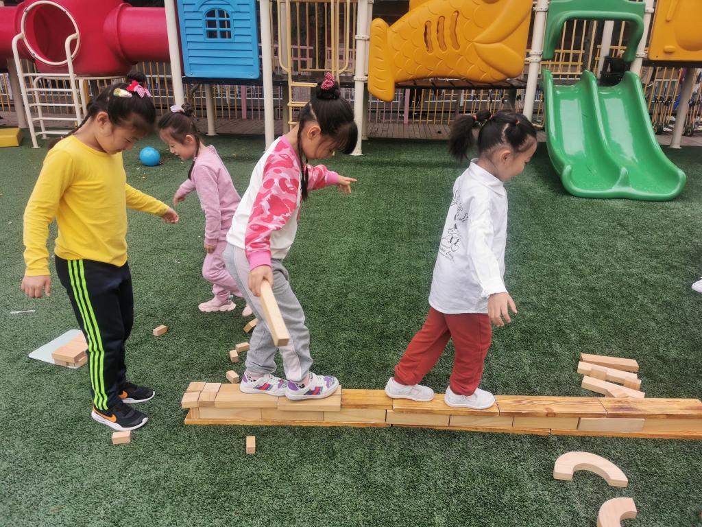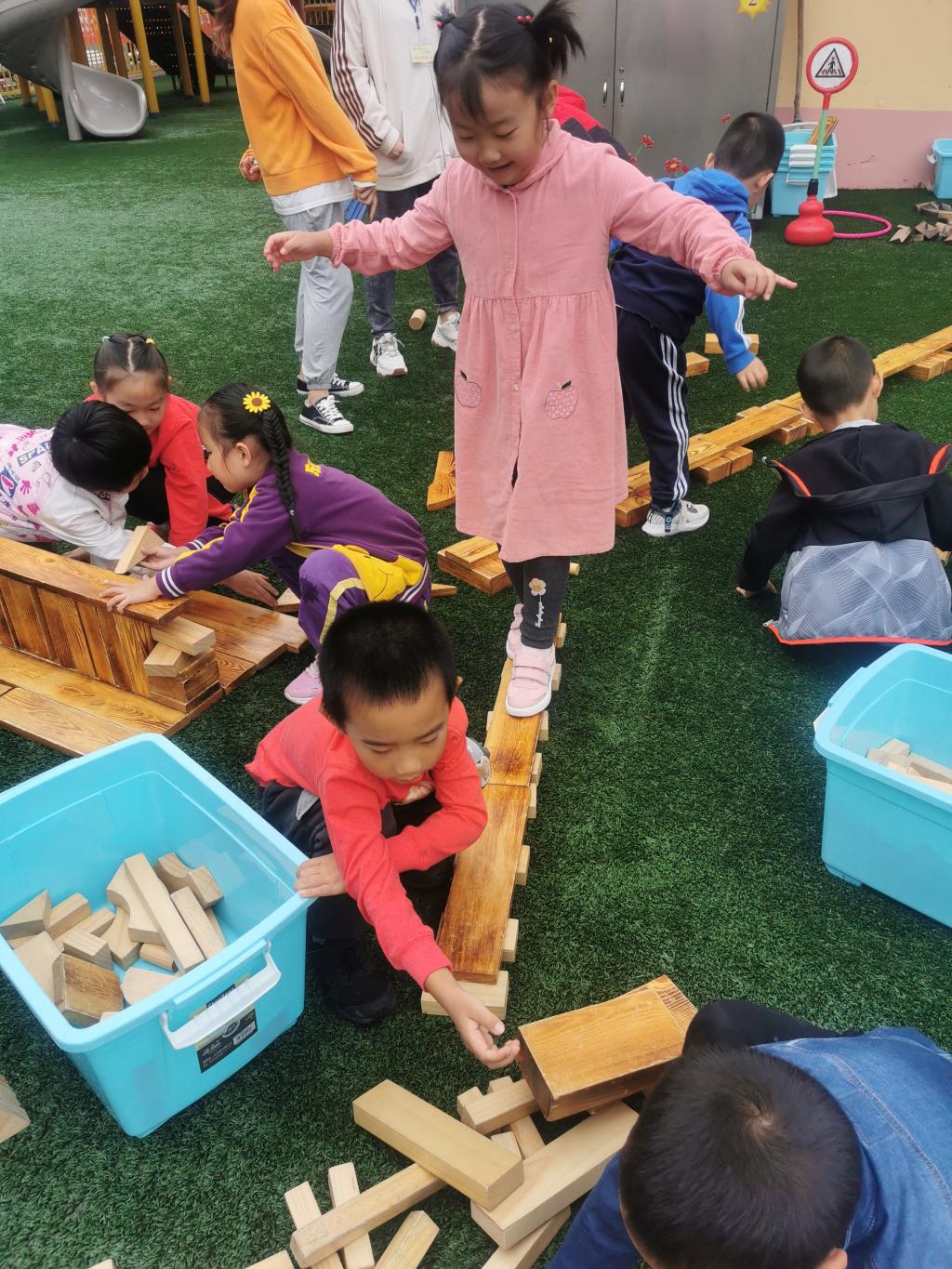户外游戏的时候,大家用碳化积木,分组建构出一座座独木桥。