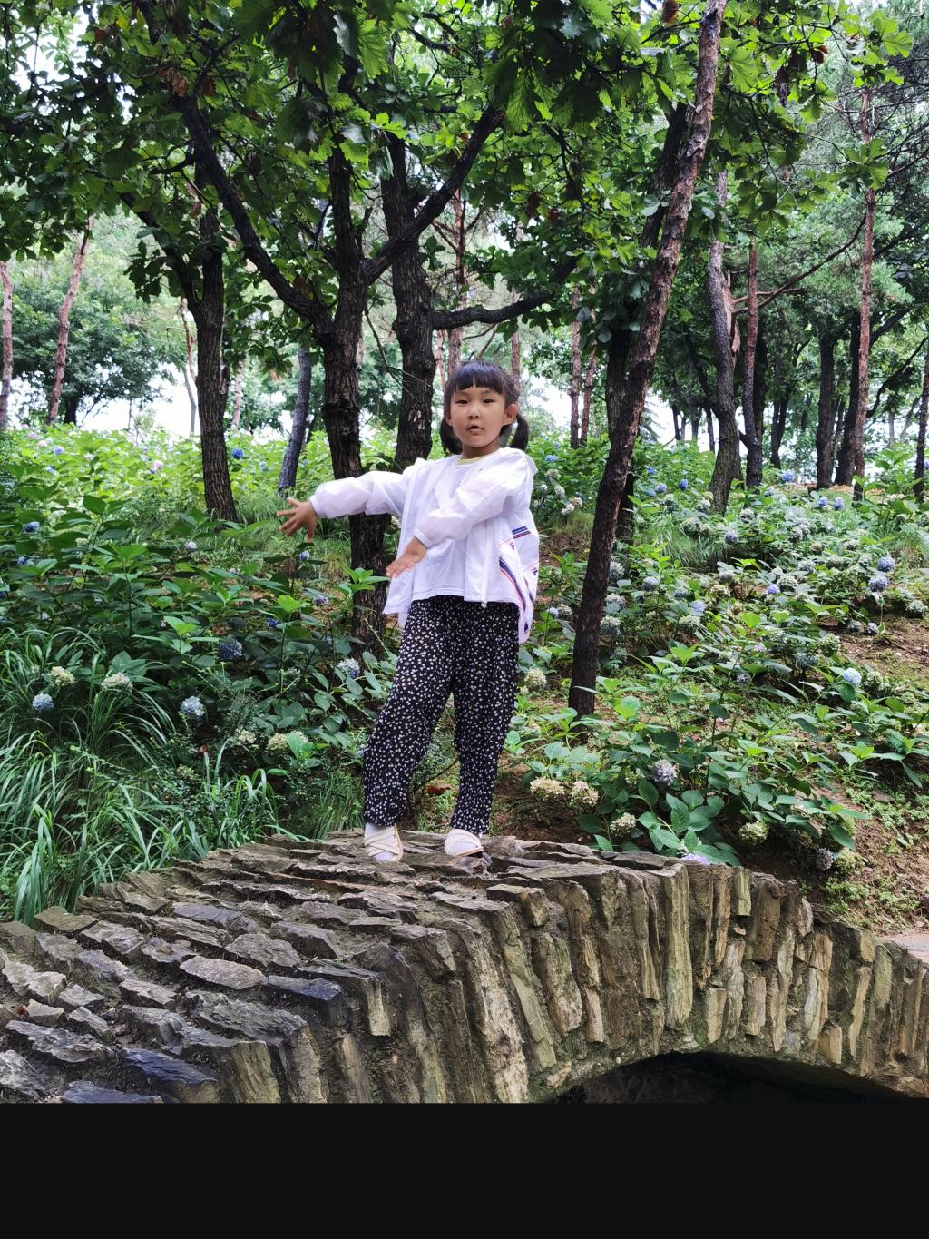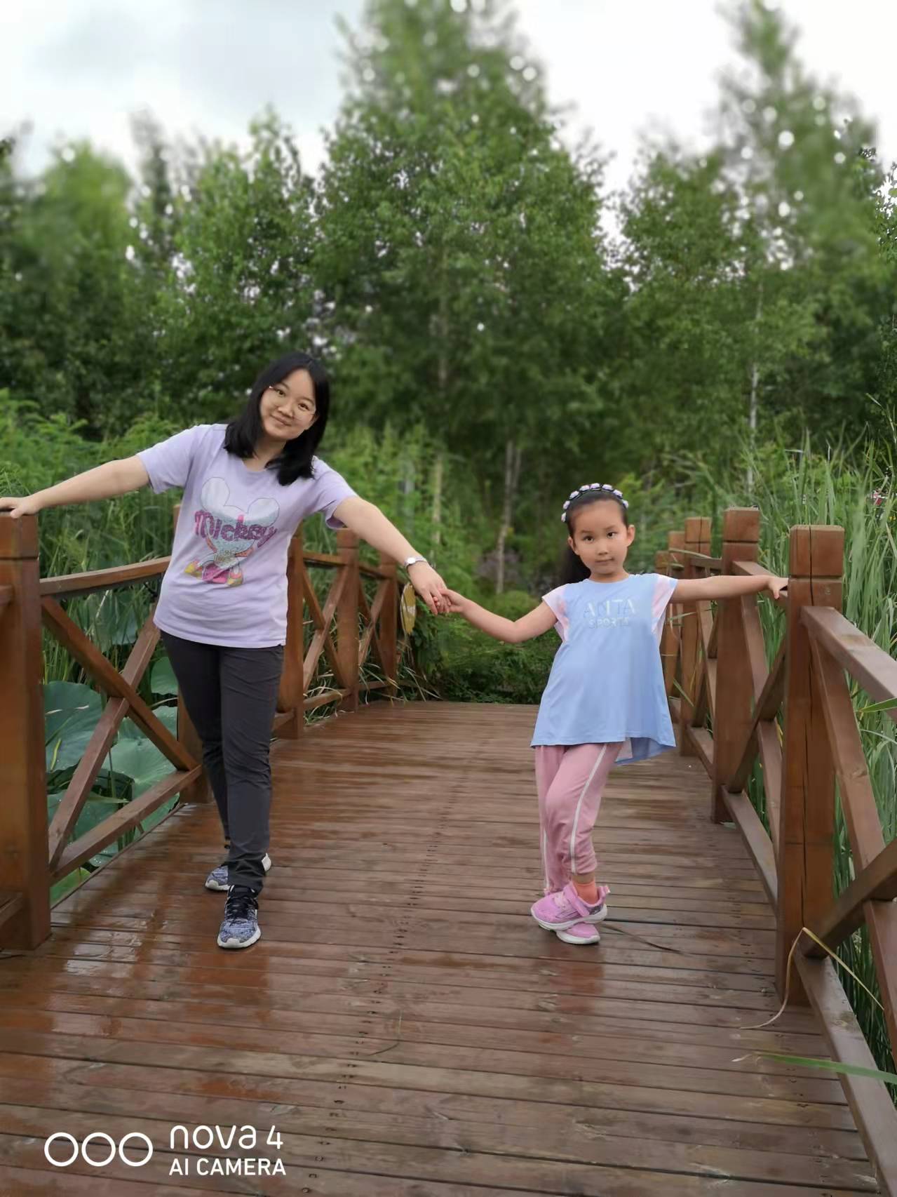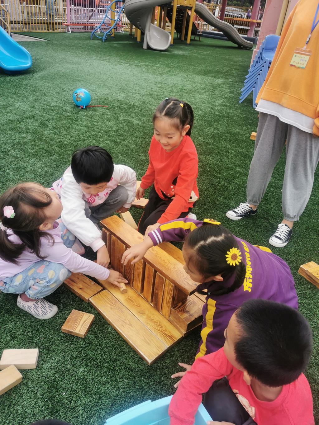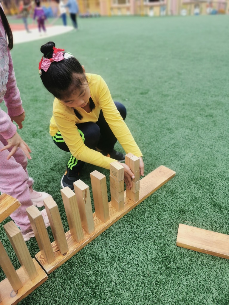 户外游戏的时候,大家用碳化积木,分组建构出一座座独木桥。