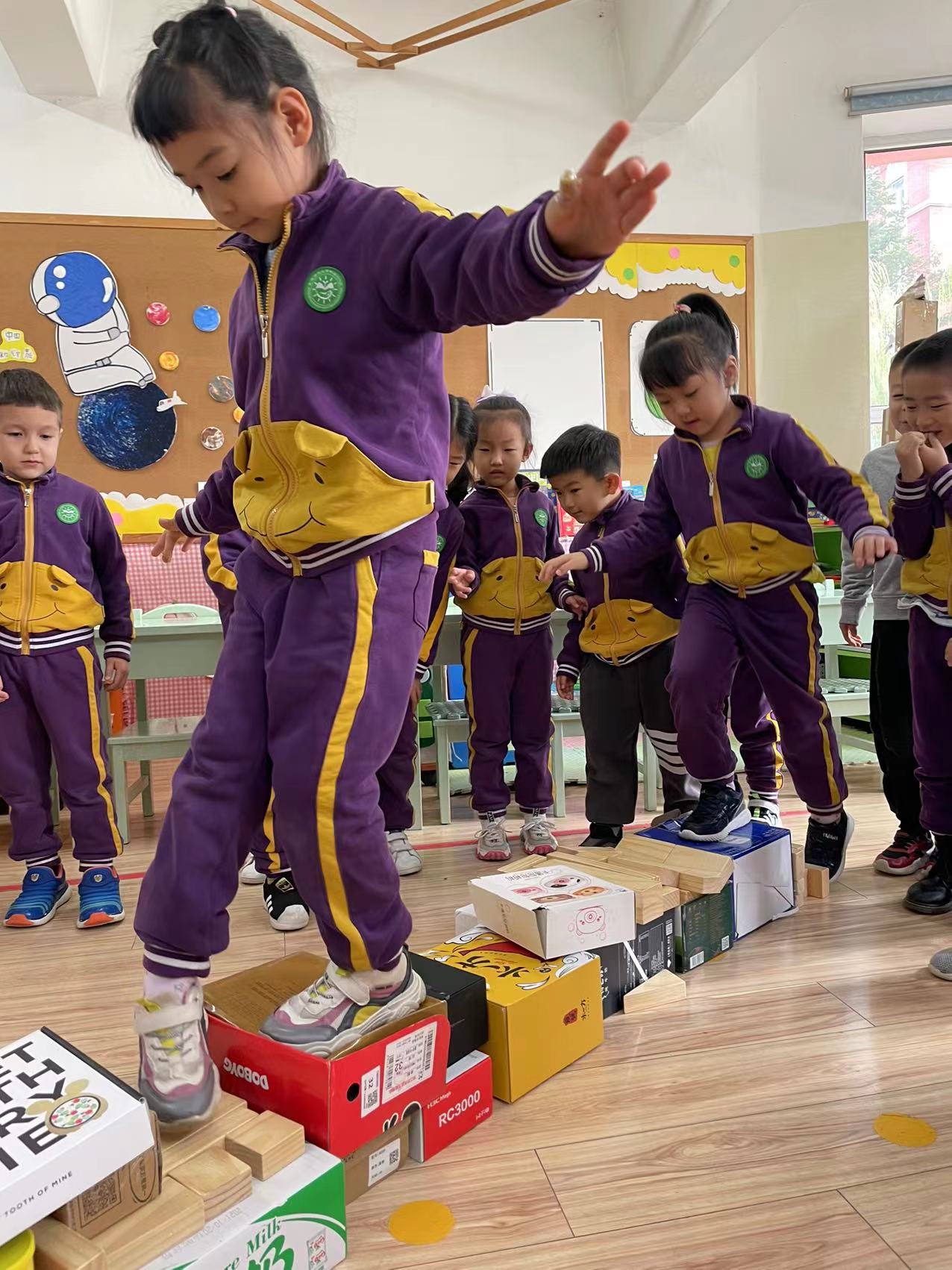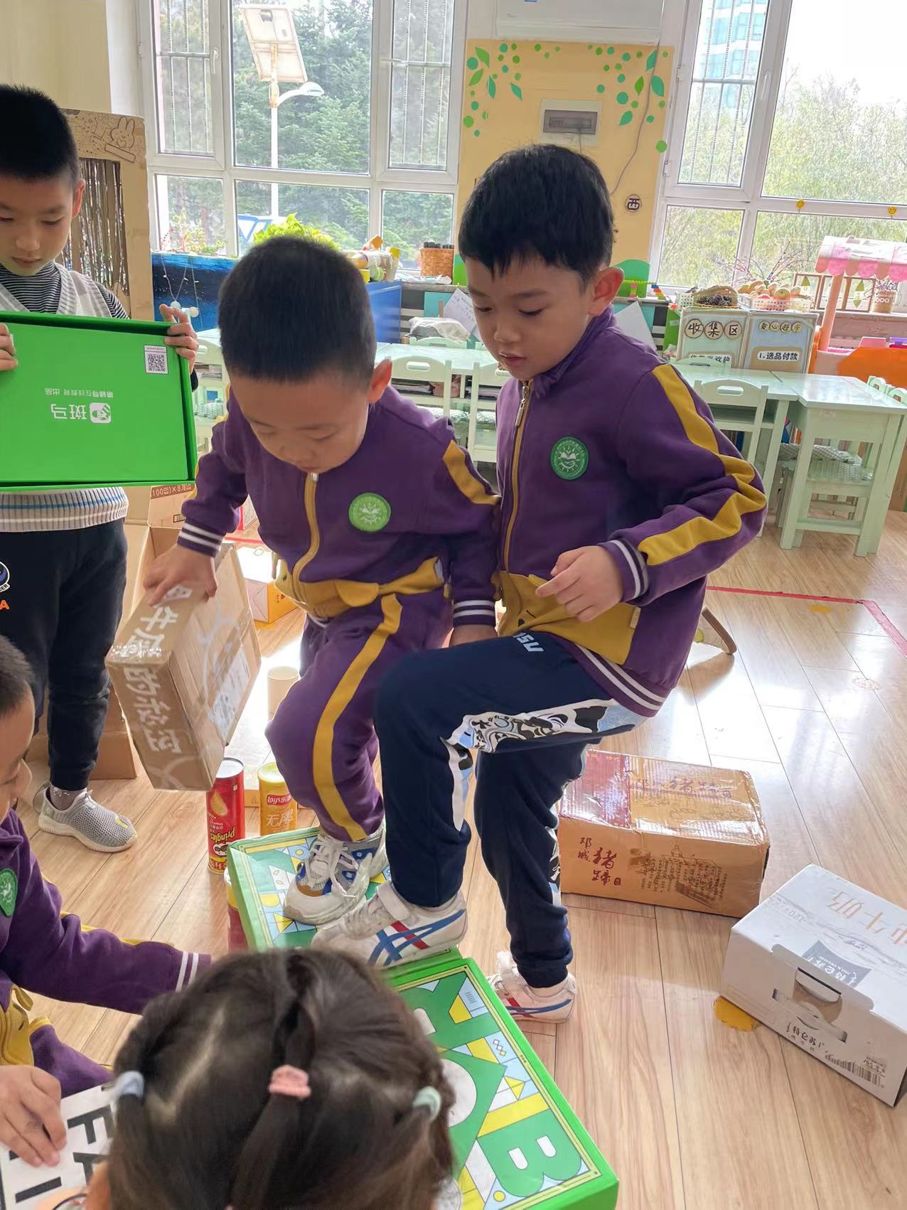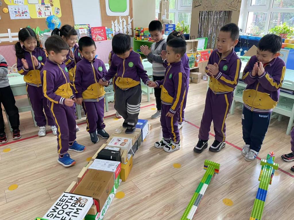 大家纷纷尝试走上这座纸盒桥,桥面软软的,但是如果三个小朋友一同上桥,桥体的纸盒还是无法承担重量,导致坍塌。