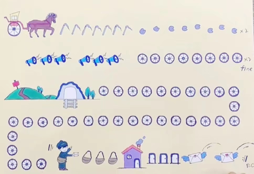 孩子们首先欣赏了世界名曲《邮递马车》。在活动中,孩子们通过欣赏音乐,感知了乐曲欢快的音乐和节奏;能认真倾听,并跟随音乐的旋律进行了律动模仿和创编;喜欢和同伴一起合作进行音乐游戏,体验着音乐带来的乐趣。教师们运用启发式教学方式,引导孩子们在音乐欣赏中发挥想象力、观察力、创造力进行创意音乐欣赏。在讨论中,小朋友们一起聊起了邮递马车在运送快递包裹过程中的情景。生成了一系列涉及不同领域的活动,趣味多多,创意满满: