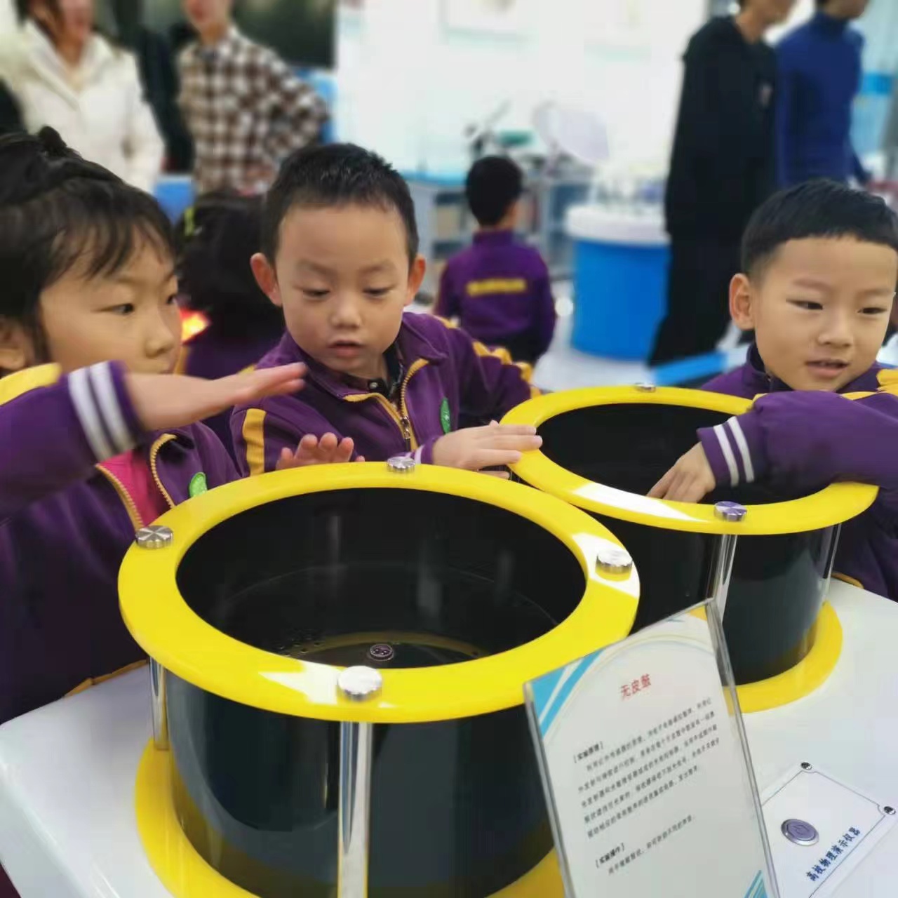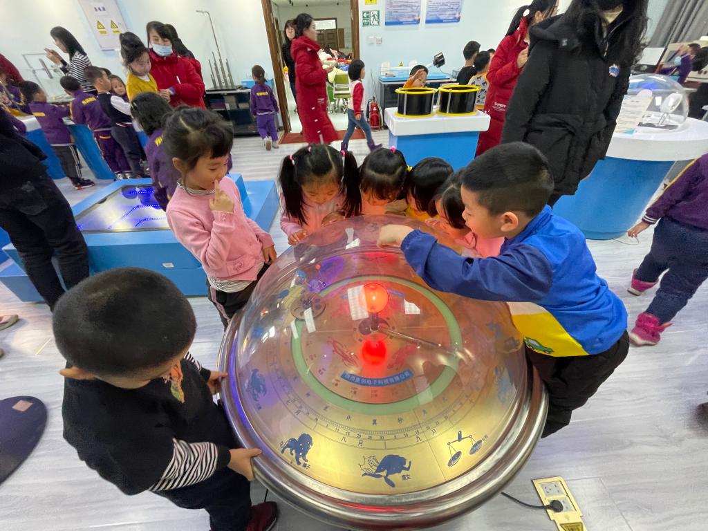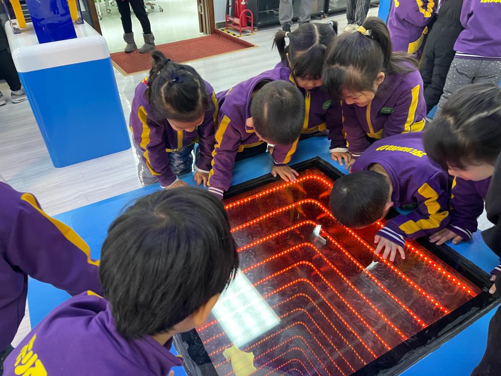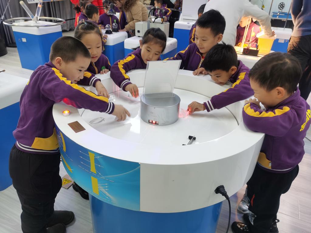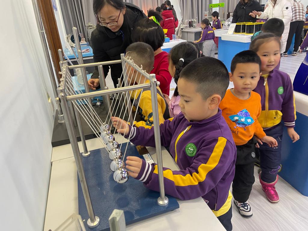 小朋友们在科技馆志愿者讲解员的带领下,参观展厅里的各种互动实验,探寻“万丈深渊”、“人造火焰”、“无皮鼓”、“趣味碰撞”、“能量守恒”等趣味实验。在体验过程中,小朋友们带着许多小问号认真观察、自由体验、动手探究,从中感受到物理的趣味。