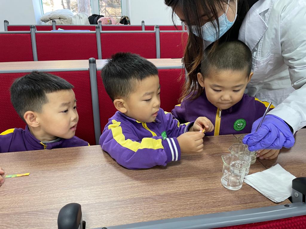 还有一个魔法纸片小实验,将pH试纸置于桌面上,分别用玻璃棒蘸取白醋和小苏打溶液点到pH试纸上。晾干后,观察颜色变化。原来pH试纸上有甲基红、溴甲酚绿、百里酚蓝这三种指示剂。甲基红、溴甲酚绿、百里酚蓝和酚酞一样,在不同pH值的溶液中均会按一定规律变色。pH试纸遇酸变红,遇碱变蓝。神奇的化学实验迎来了小朋友们的阵阵掌声。快乐的实验时光结束了,小朋友们依依不舍地和工作人员告别,并约定好下次继续探索科学的奥秘。